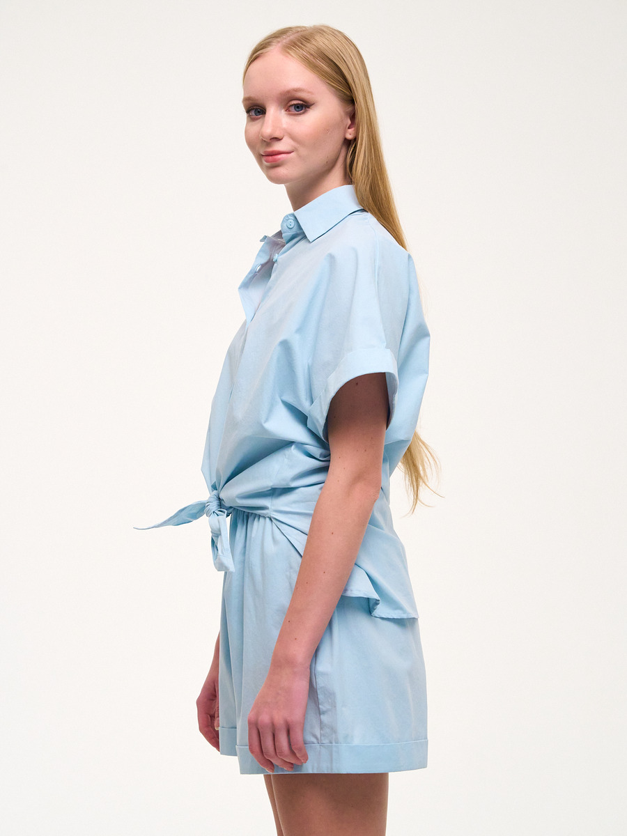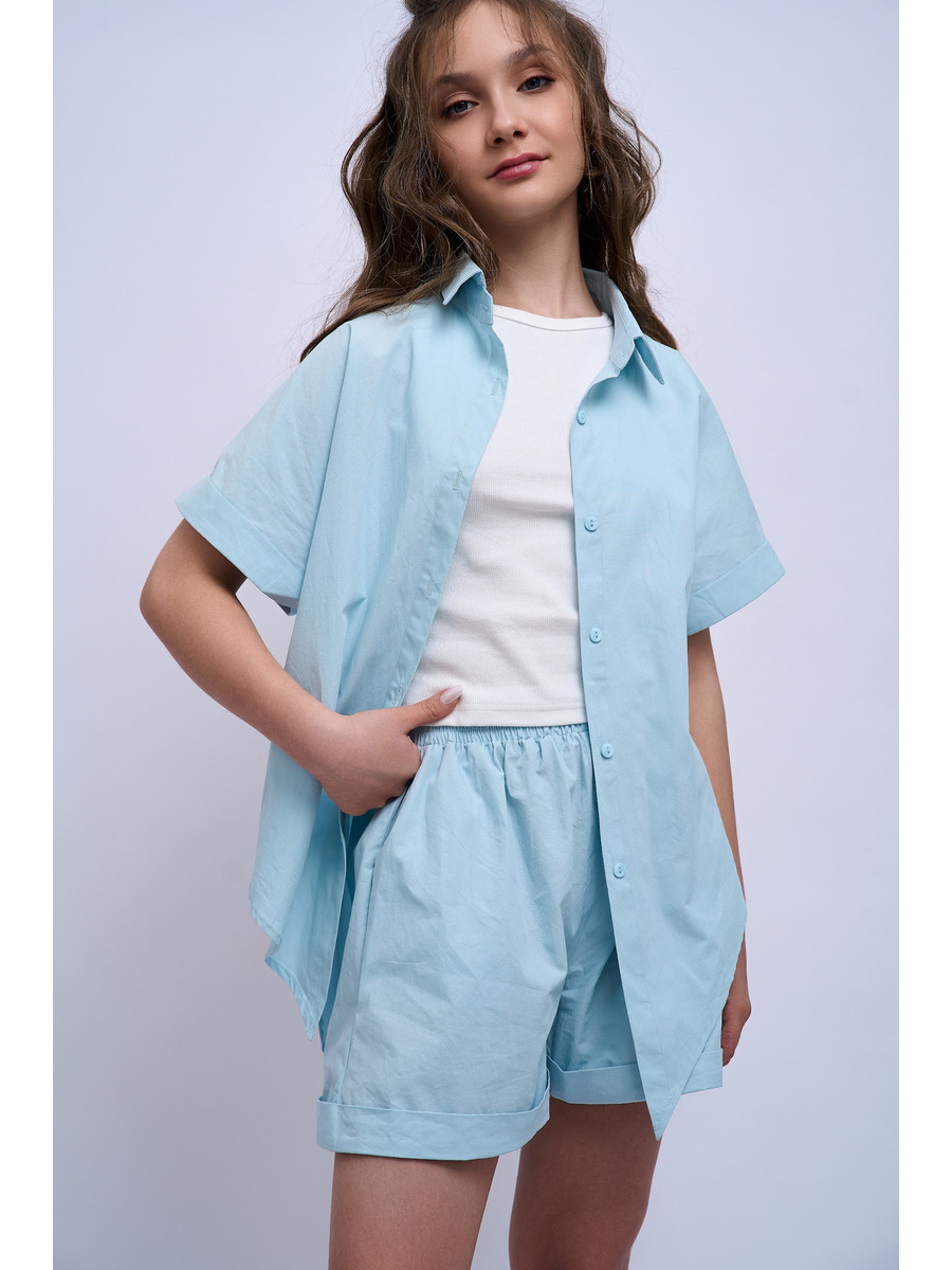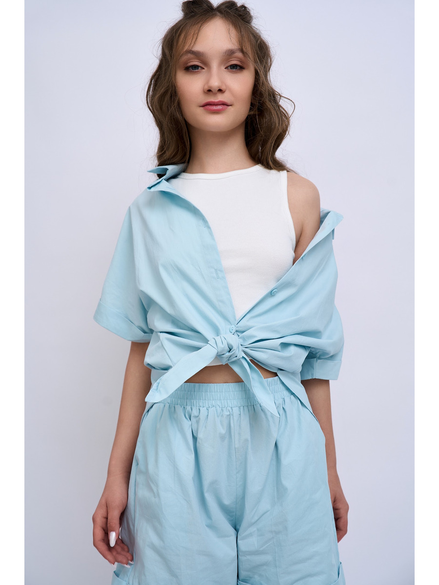 Комплект из легкого текстиля: рубашка с коротким рукавом и шорты. Рубашка на завязках спереди.