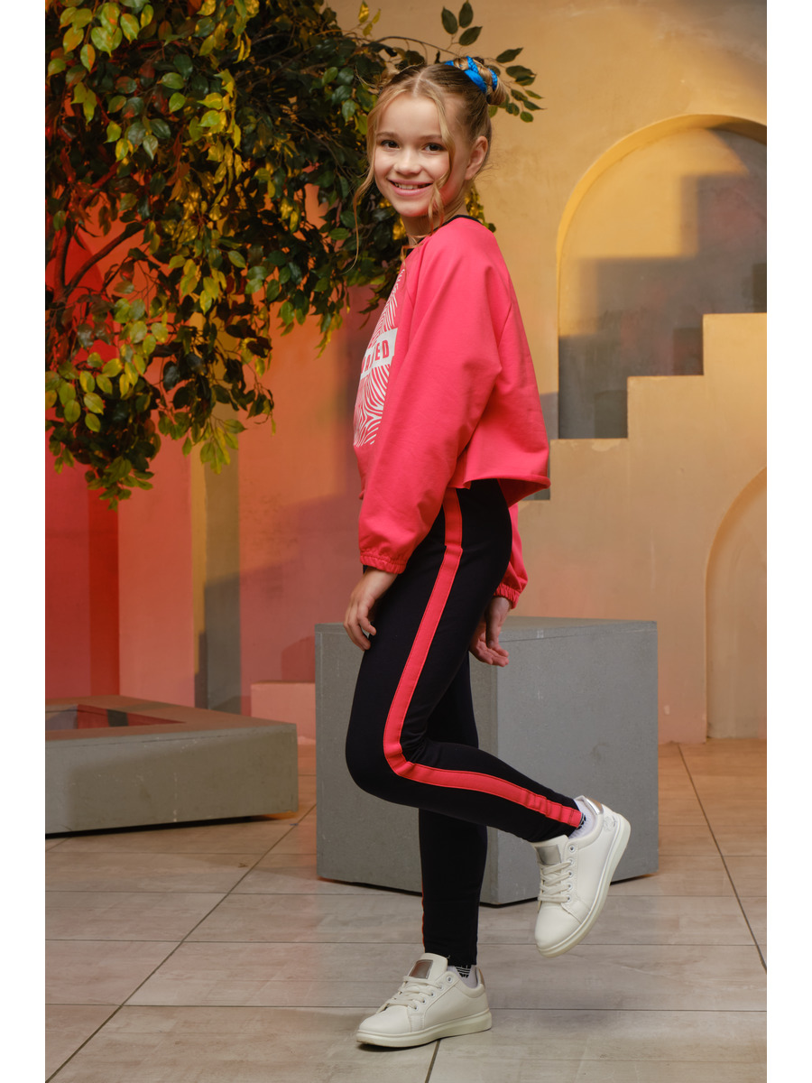 Комплект из футера состоит из укороченного свитшота низ которого обработан открытым срезом, рукав реглан. По кругу горловины - планка. Низ рукава на притачной манжете. Перед декарирован принтом. Легинсы и полочка свитшота декорированы контрастным лампасом.