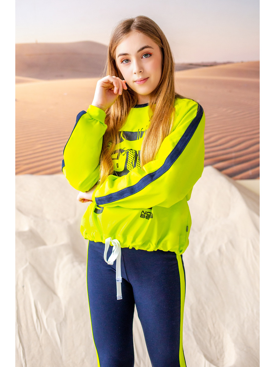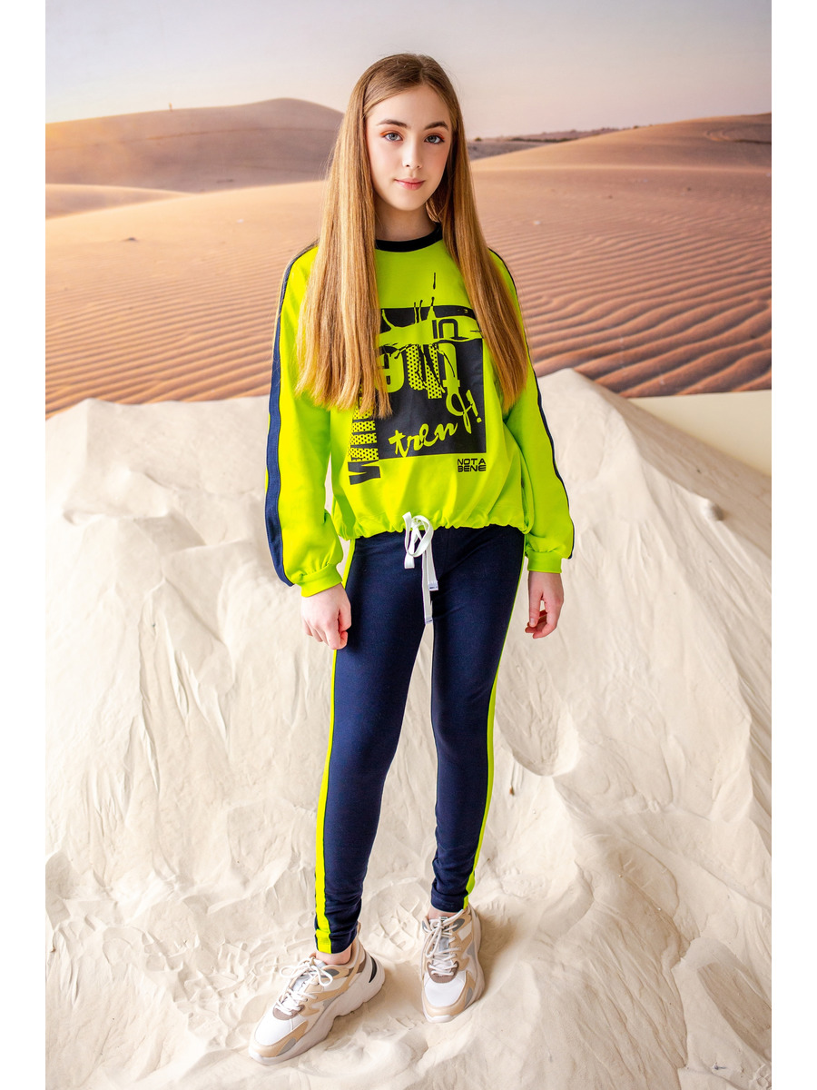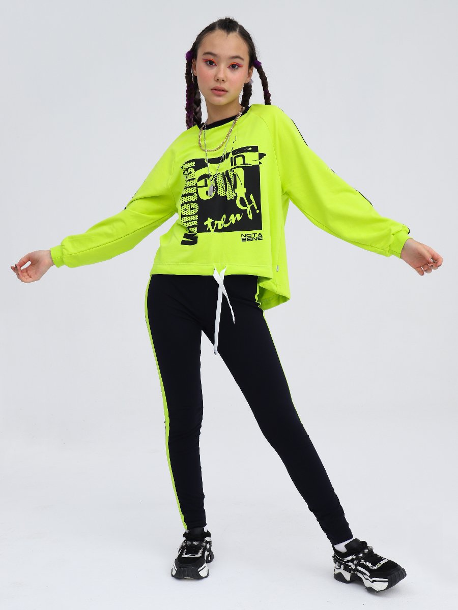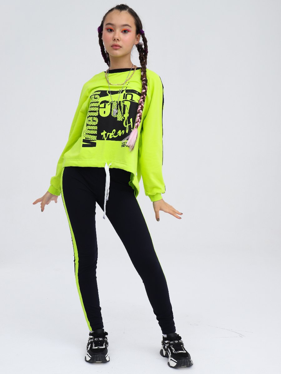 Комплект из футера состоит из свитшота низна шнурке, рукав реглан. По кругу горловины - планка. Низ рукава на притачной манжете. Перед декарирован принтом. Легинсы и полочка свитшота декорированы контрастным лампасом.
