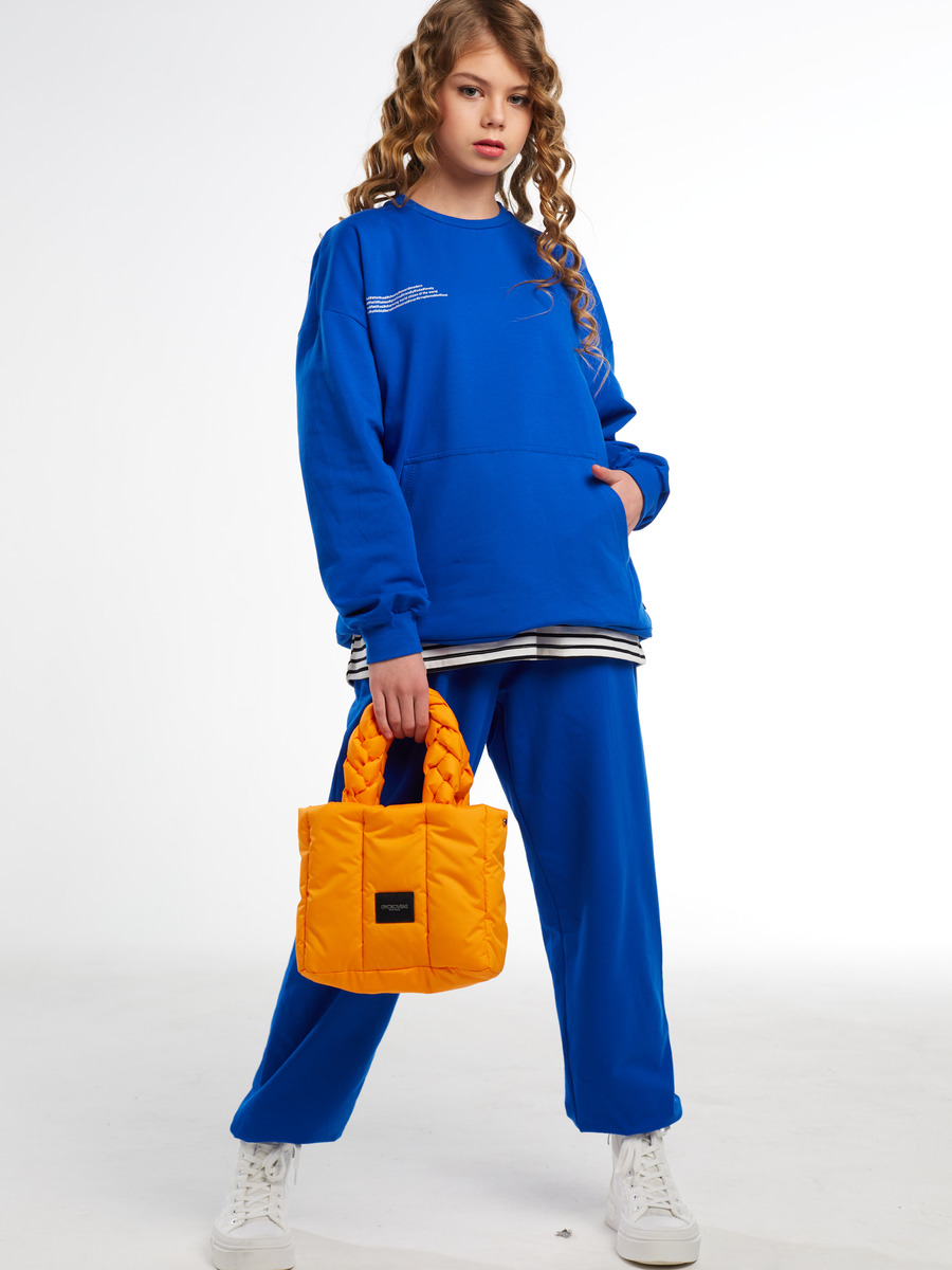 Костюм спортивный состоящий из свитшота и брюк. Свитшот свободного кроя, круглая горловина, длинные рукава и карман "кенгуру" спереди. Брюки с высокой посадкой. Эластичный пояс на регулируемом шнурке, манжеты, карманы в боковых швах.