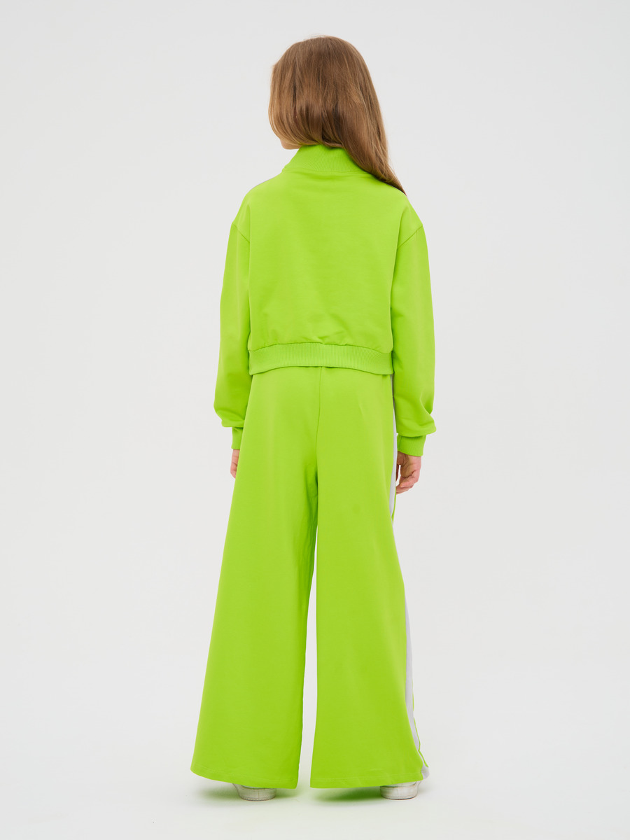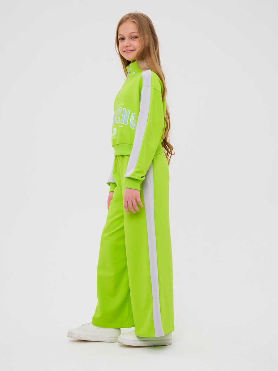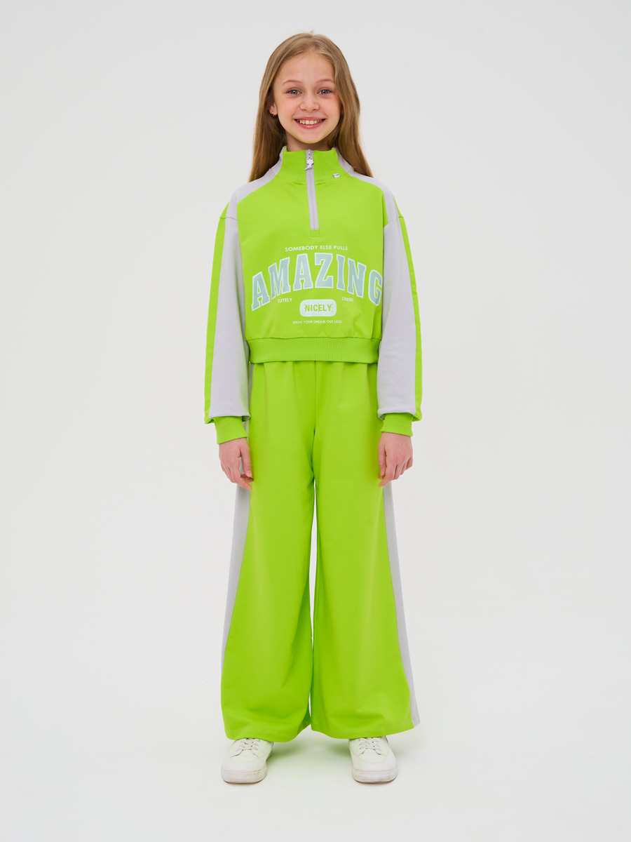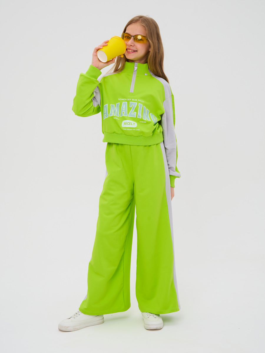 Костюм спортивный из футера с лайкрой: толстовка и брюки. Толстовка прямая, длинный рукав на манжете, воротник-стойка, застежка на короткую молнию. Брюки средней посадки, длинные, широкие к низу, эластичный пояс. Широкие вставки по боковым швам. Спереди принт.