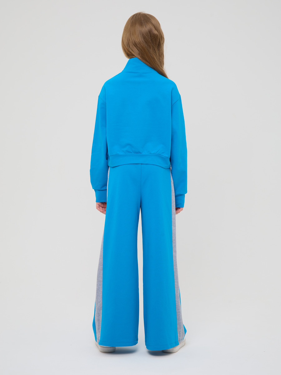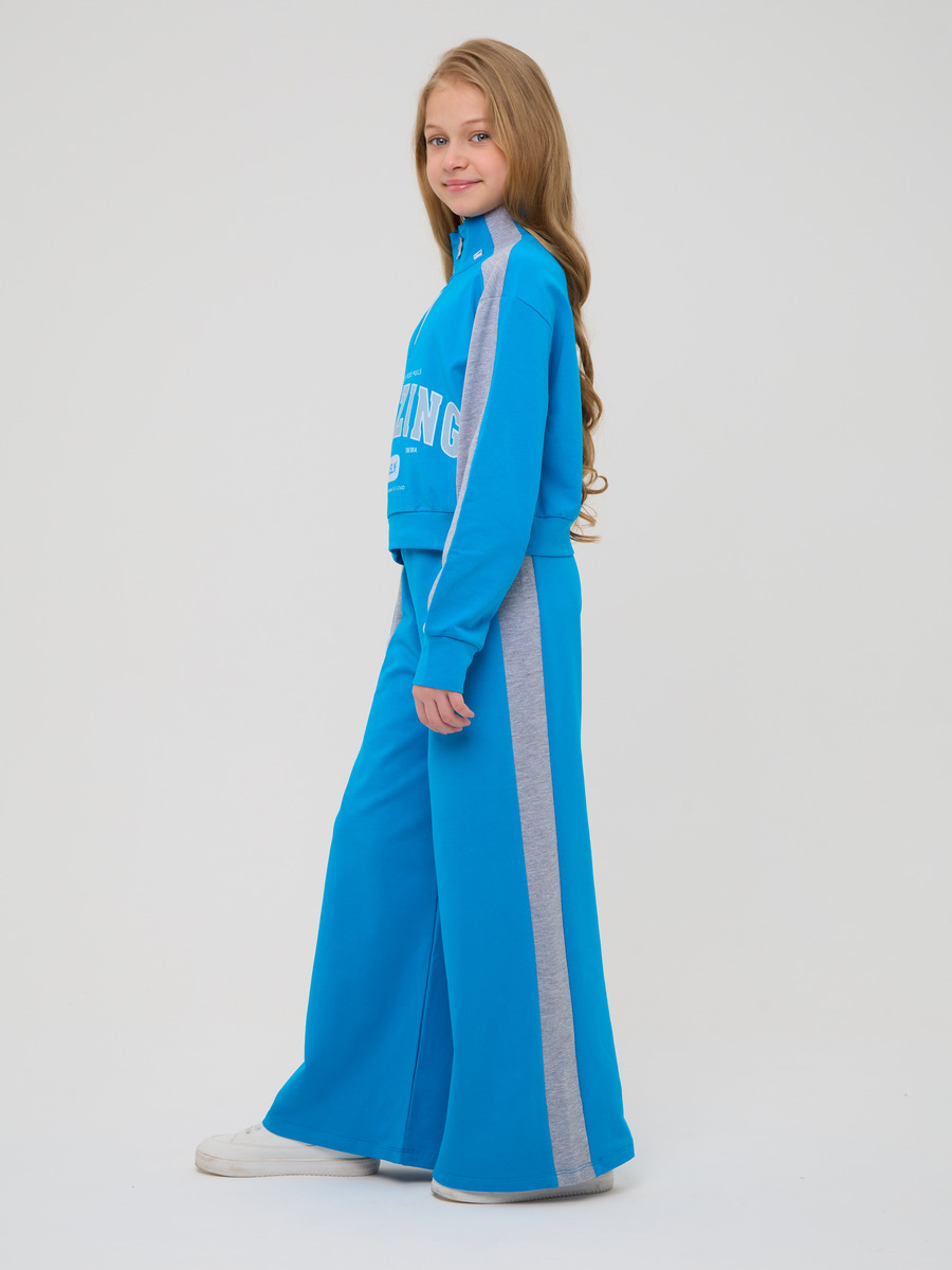 Костюм спортивный из футера с лайкрой: толстовка и брюки. Толстовка прямая, длинный рукав на манжете, воротник-стойка, застежка на короткую молнию. Брюки средней посадки, длинные, широкие к низу, эластичный пояс. Широкие вставки по боковым швам. Спереди принт.