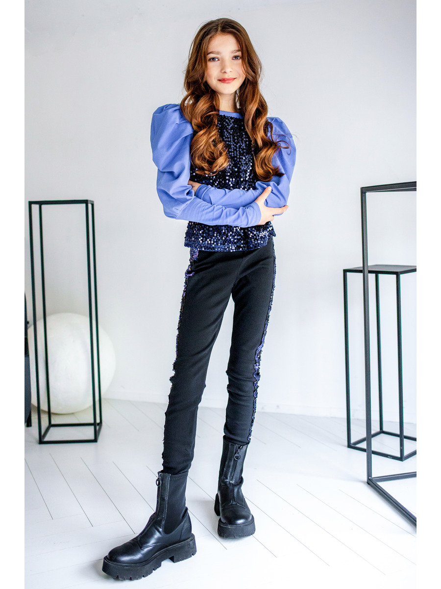 Лонгслив нарядный прилегающий, с объемными рукавами. Горловина круглая, перед из полотна с пайетками.
