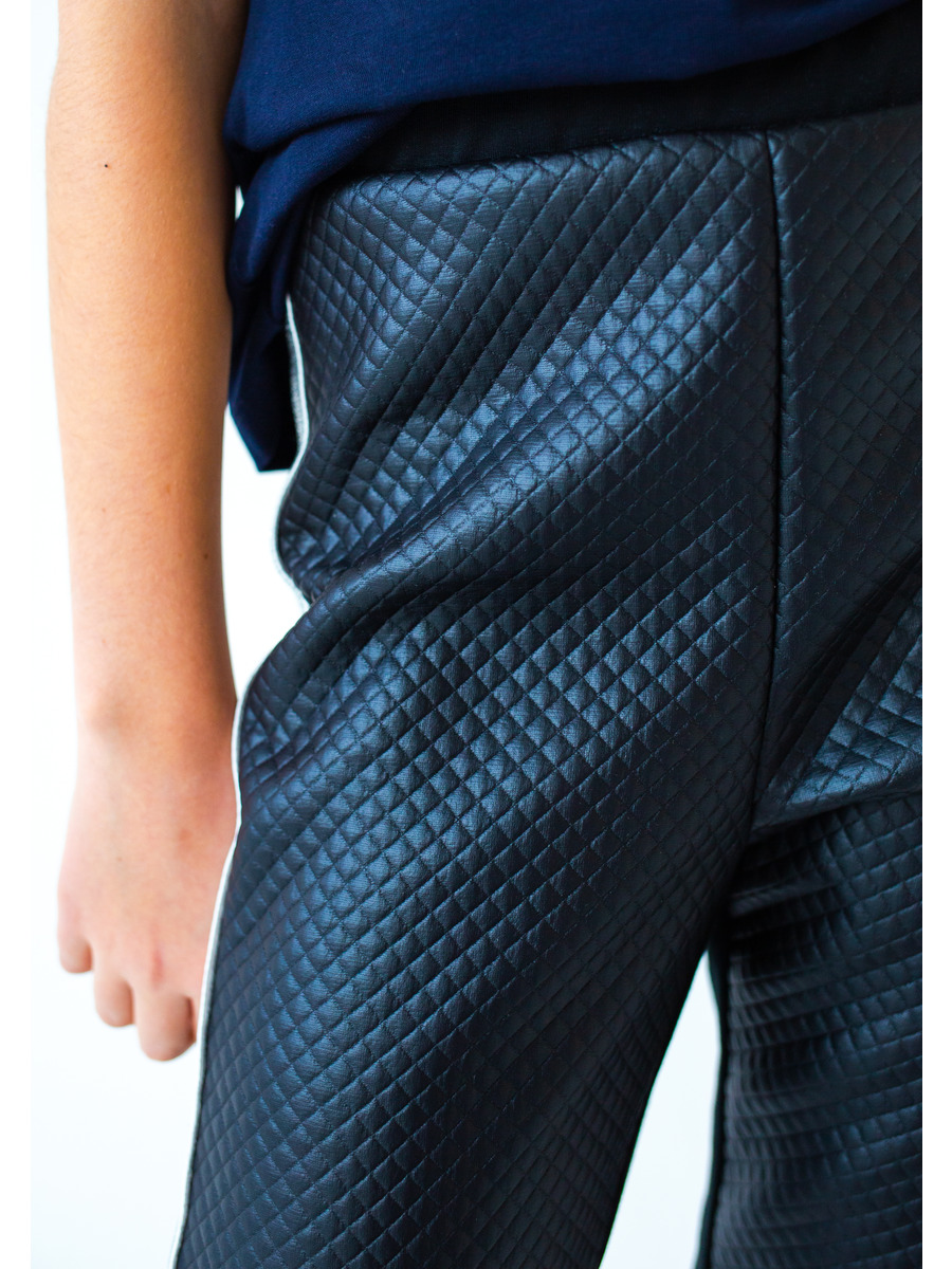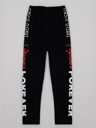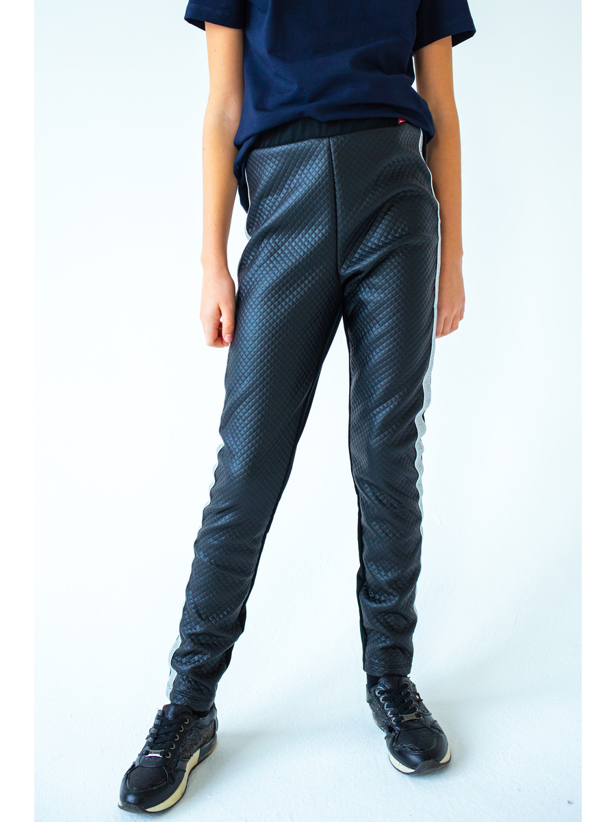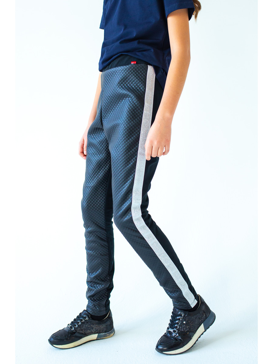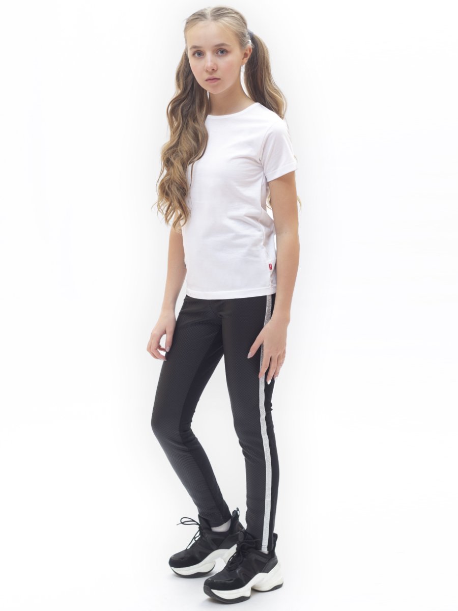 Леггинсы для девочки прилегающего силуэта из тканей компаньонов. Пояс на резинке. По боку-лампас.