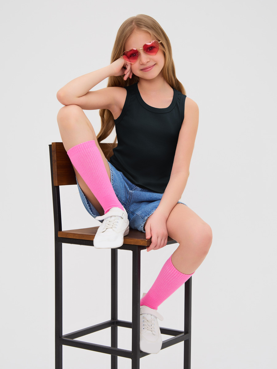 Майка для девочки из кашкорсе, облегающего силуэта чуть ниже талии.