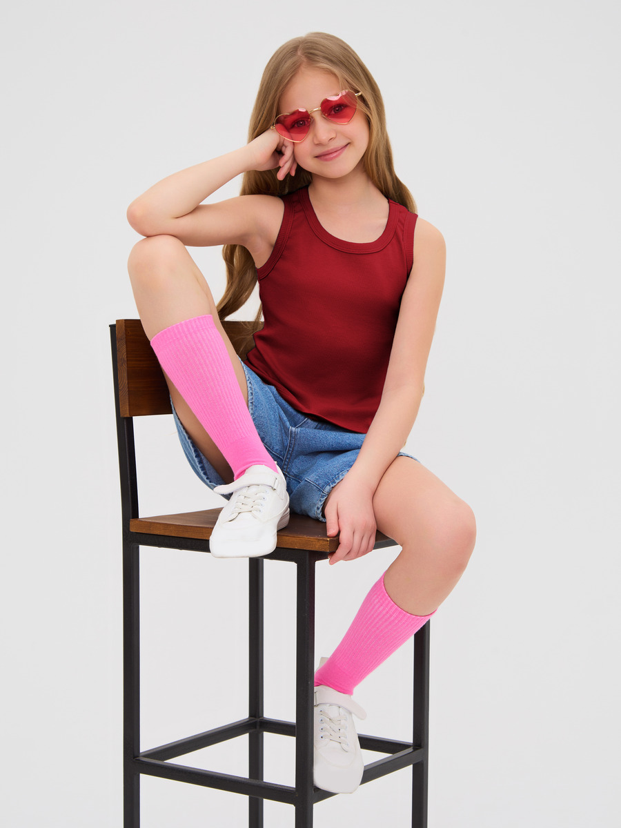 Майка для девочки из кашкорсе, облегающего силуэта чуть ниже талии.