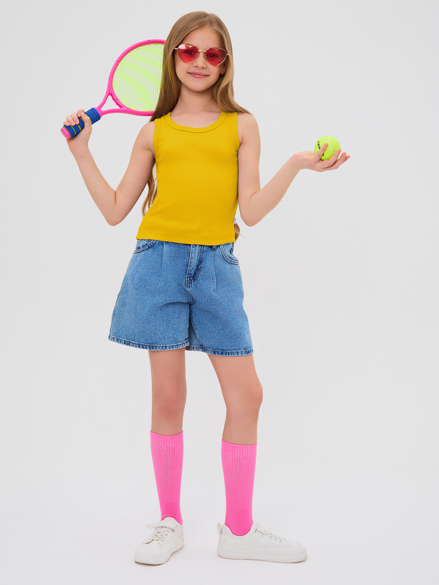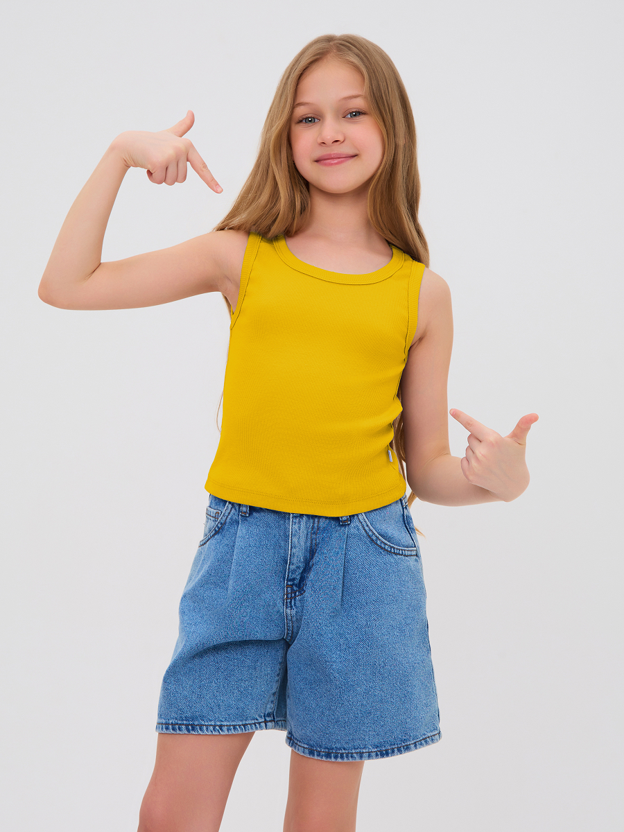 Майка для девочки из кашкорсе, облегающего силуэта чуть ниже талии.