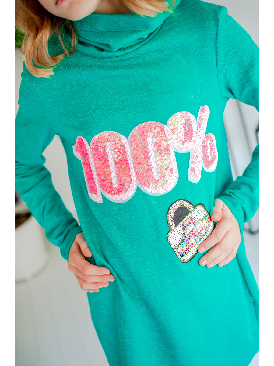Платье для девочки из футера, свободного силуэта, с длинными втачными рукавами с отверстием для большого пальца. Горловина оформлена широким воротником-"труба". Перед декорирован аппликацией. Низ изделия фигурный.