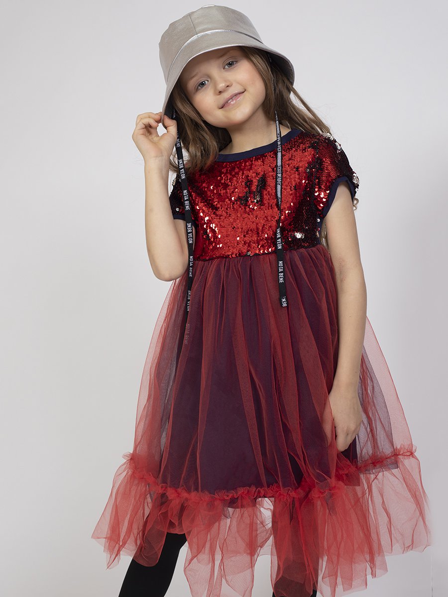Платье нарядное для девочки полуприлегающего силуэта с втачными короткими рукавами. Платье отрезное по линии талии, полочка и рукава выполнены из ткани с пайетками, юбка пышная с 2-мя слоями сетчатого фатина на подкладке, верхний слой юбки декорирован по низу пышной оборкой. С изнаночной сторны платье обработано подкладкой, все швы окантованы мягким полотном.