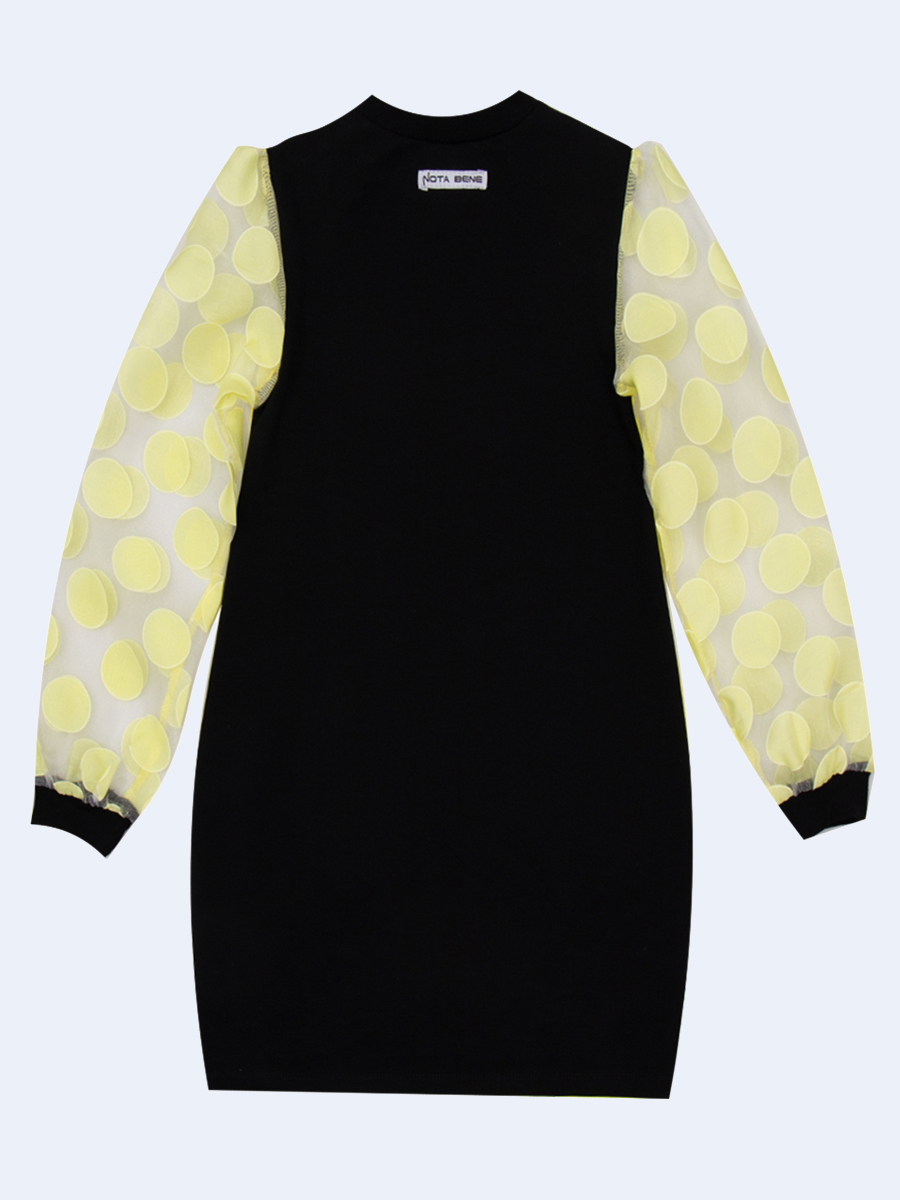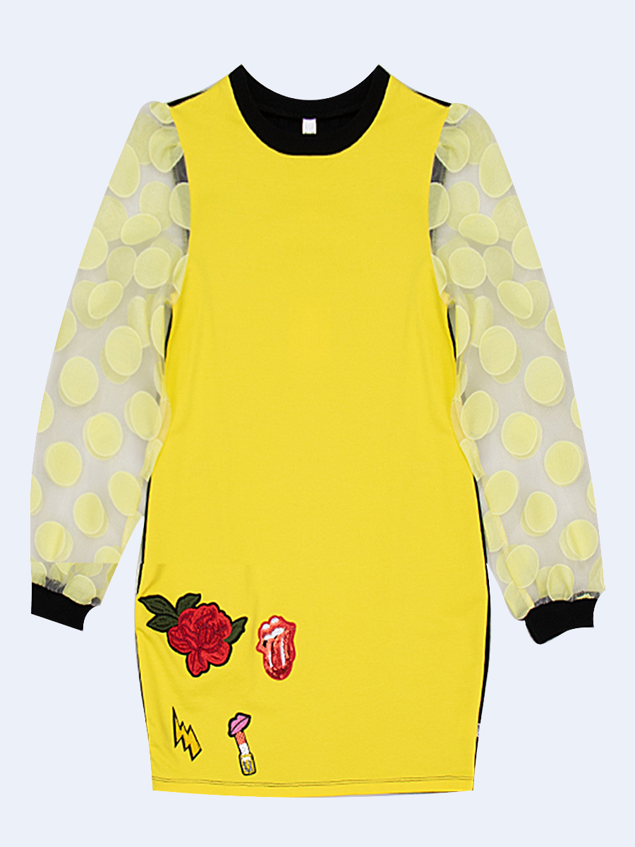 Платье трикотажное, О-силуэта, средней длины. Горловина круглая. На полочке - принт. Рукав длинный втачной из прозрачной органзы на манжетах