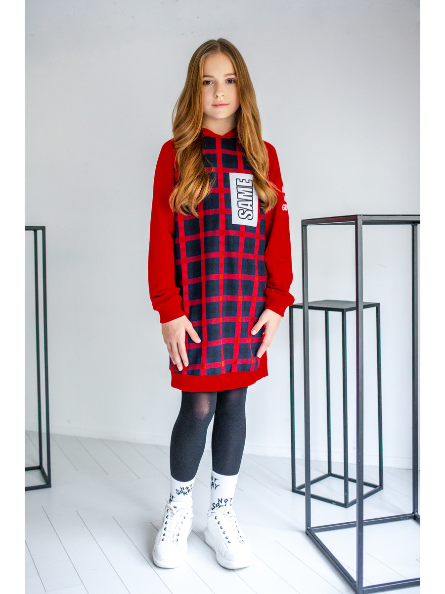 Платье прямого силуэта с капюшоном и карманом кенгуру для девочки. На полочке из текстильной ткани нашивка. Рукав реглан, длинный контрастного цвета с манжетой. По низу пояс.