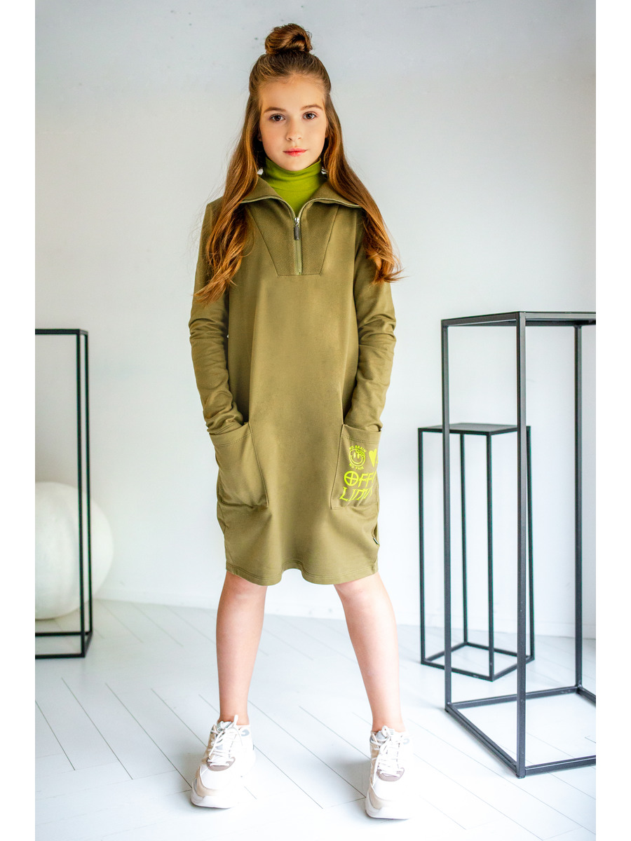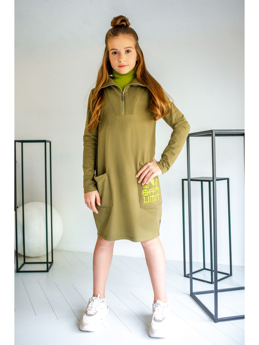 Платье О-образное, с длинными рукавами. Воротник-стойка, застежка на молнию до уровня груди, накладные карманы, принт.