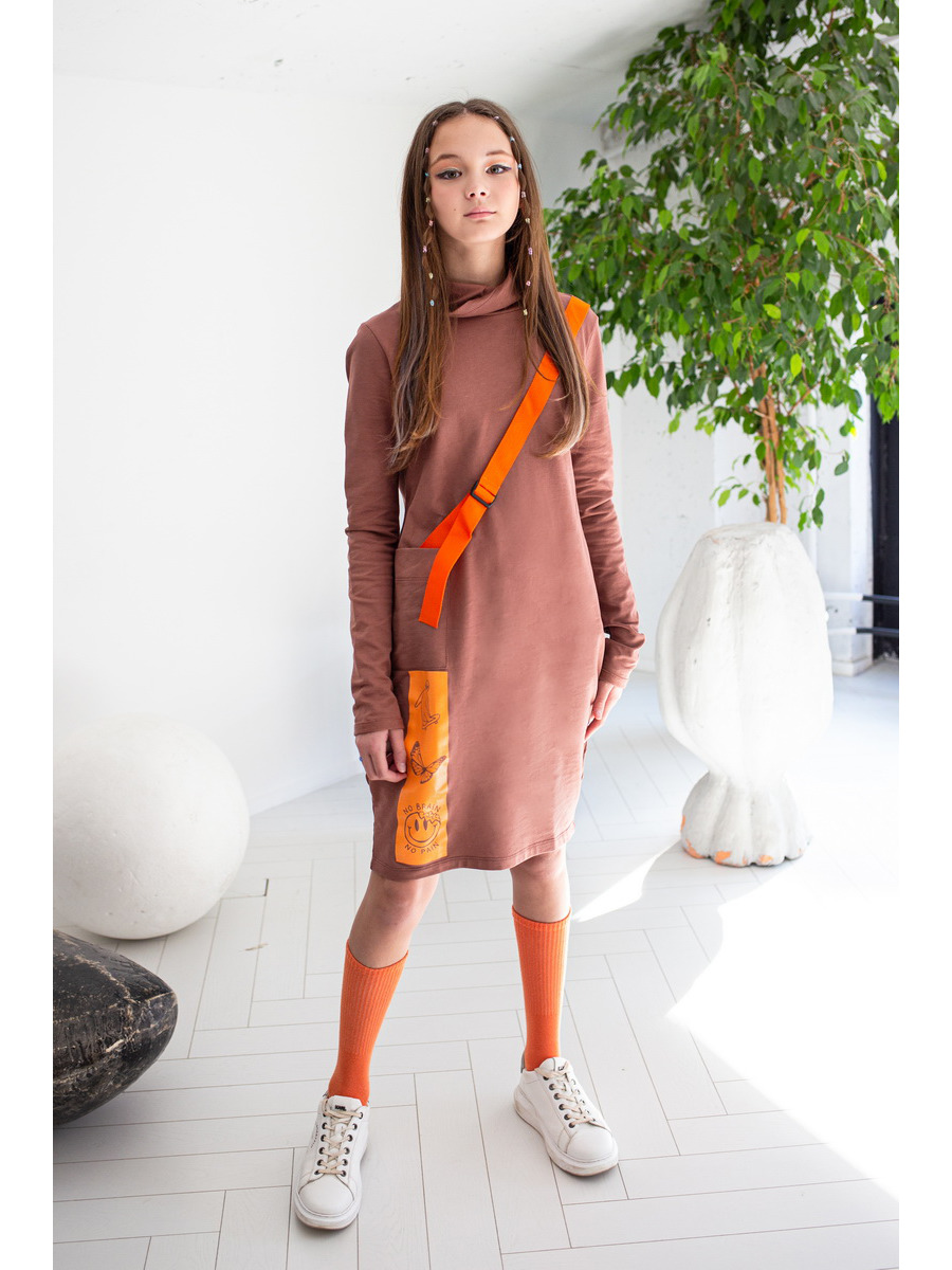 Платье миди объемного кроя, с длинными рукавами, широким воротником-стойкой и карманом, декорировано принтом и ремешком спереди.