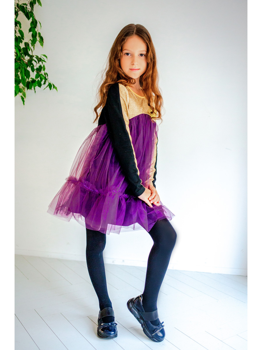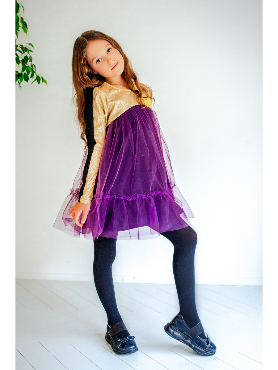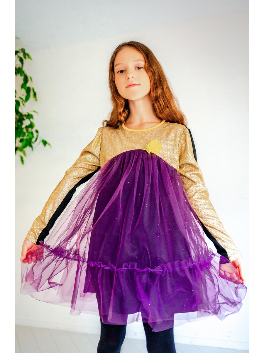 Платье нарядное свободного кроя, длинные рукава, многослойная юбка из полупрозрачного полотна и трикотажная нижняя юбка.
