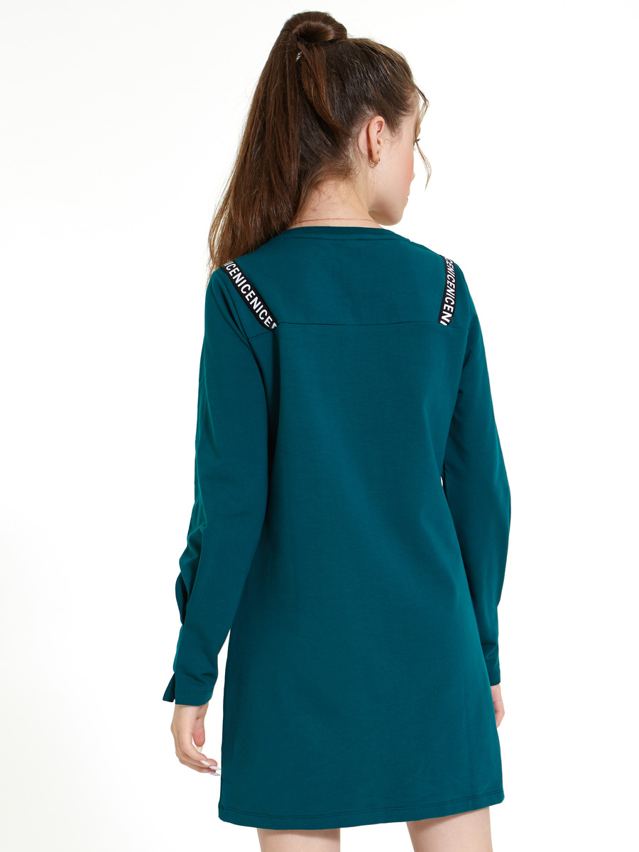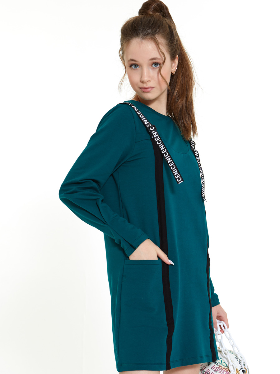 Платье из футера 2-х нитки с лайкой, полуприлегающее с прорезными карманами, настрочными лампасами, декоративными лентами с пряжками, груглая горловина. Длинный рукав в низу со складкой.