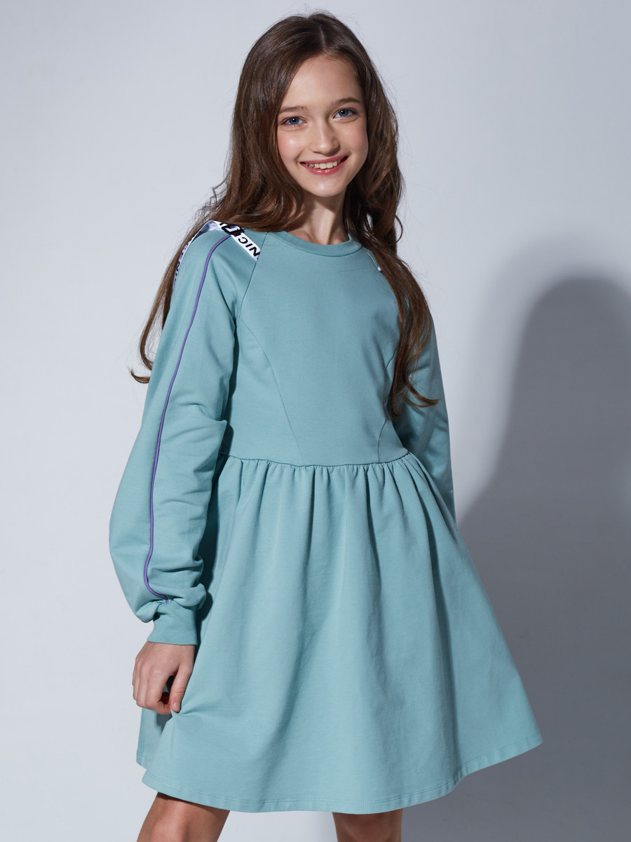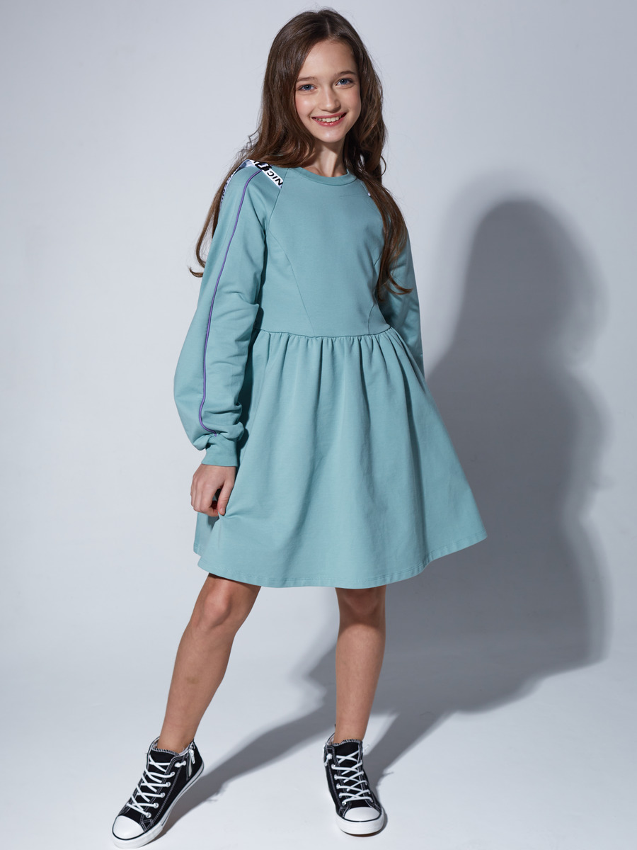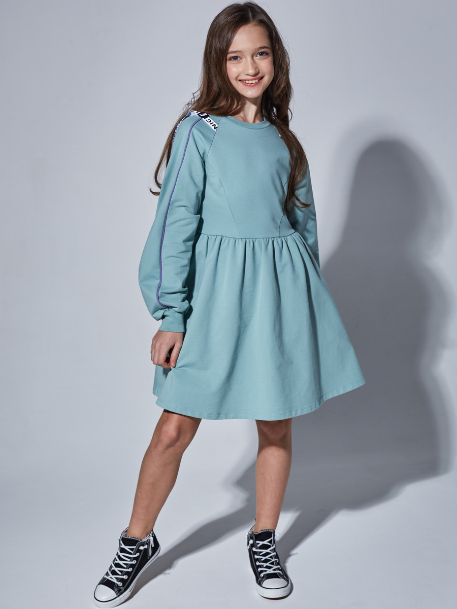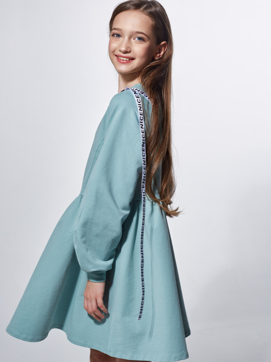 Платье полуприлегающего силуэта из футера 2-х нитки с лайкрой. Платье длиной ниже колена, отрезное по талии, длинный объемный рукав на манжете, горловина круглая. В качестве декора лента по плечевым швам.