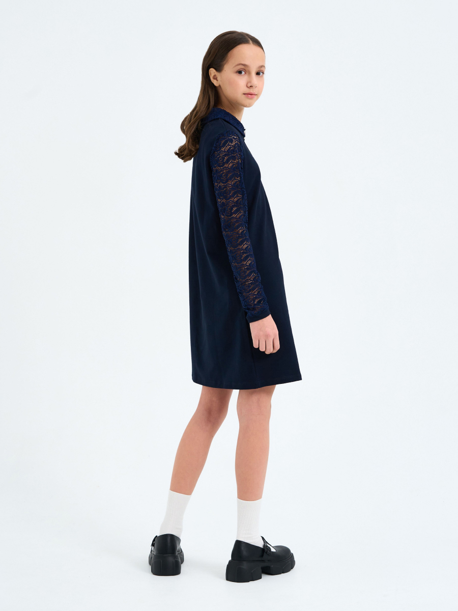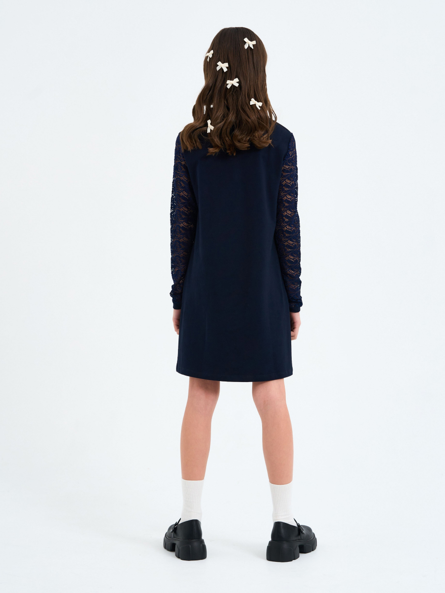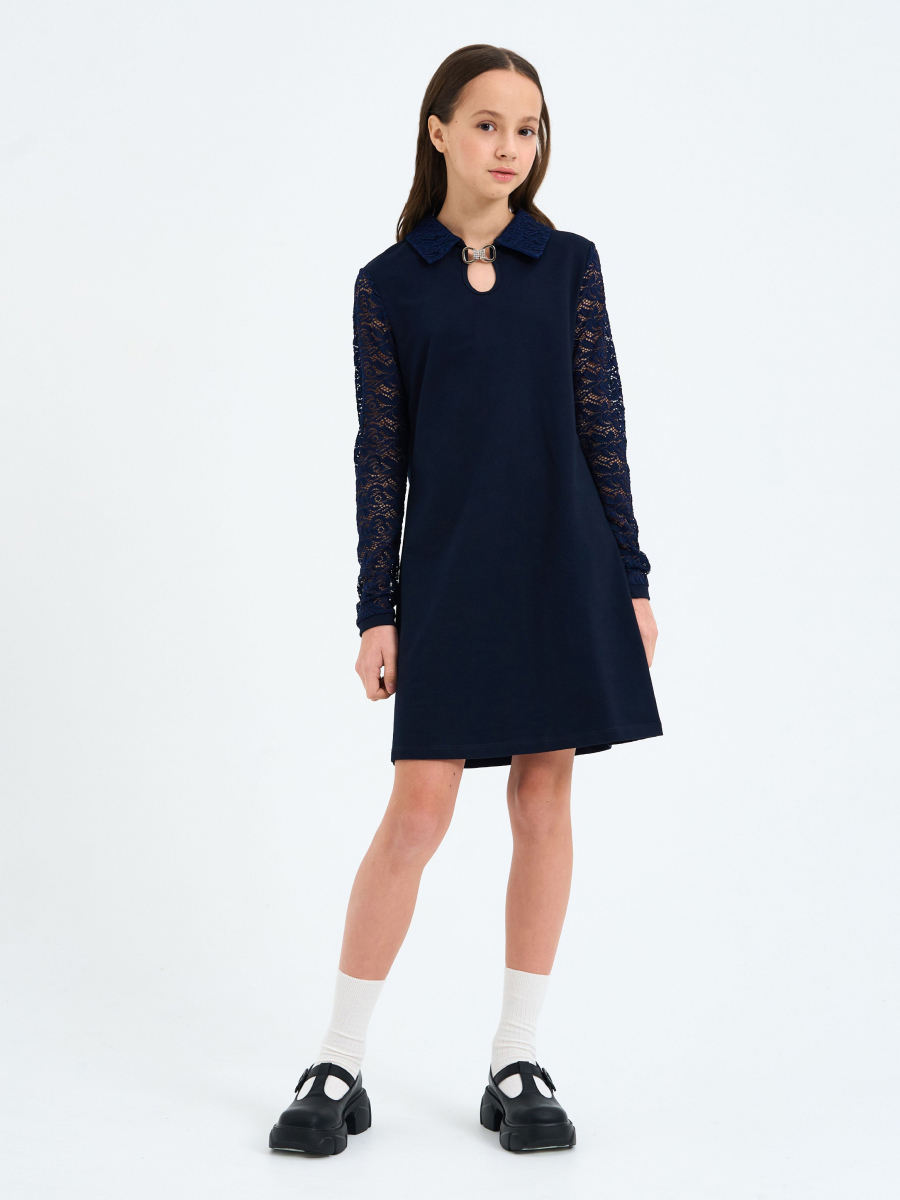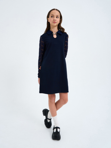 Платье трапециевидного силуэта из футера с лайкрой, длинный рукав из гипюра на манжете, отложной воротник, вырез "капля" и застежка спереди.