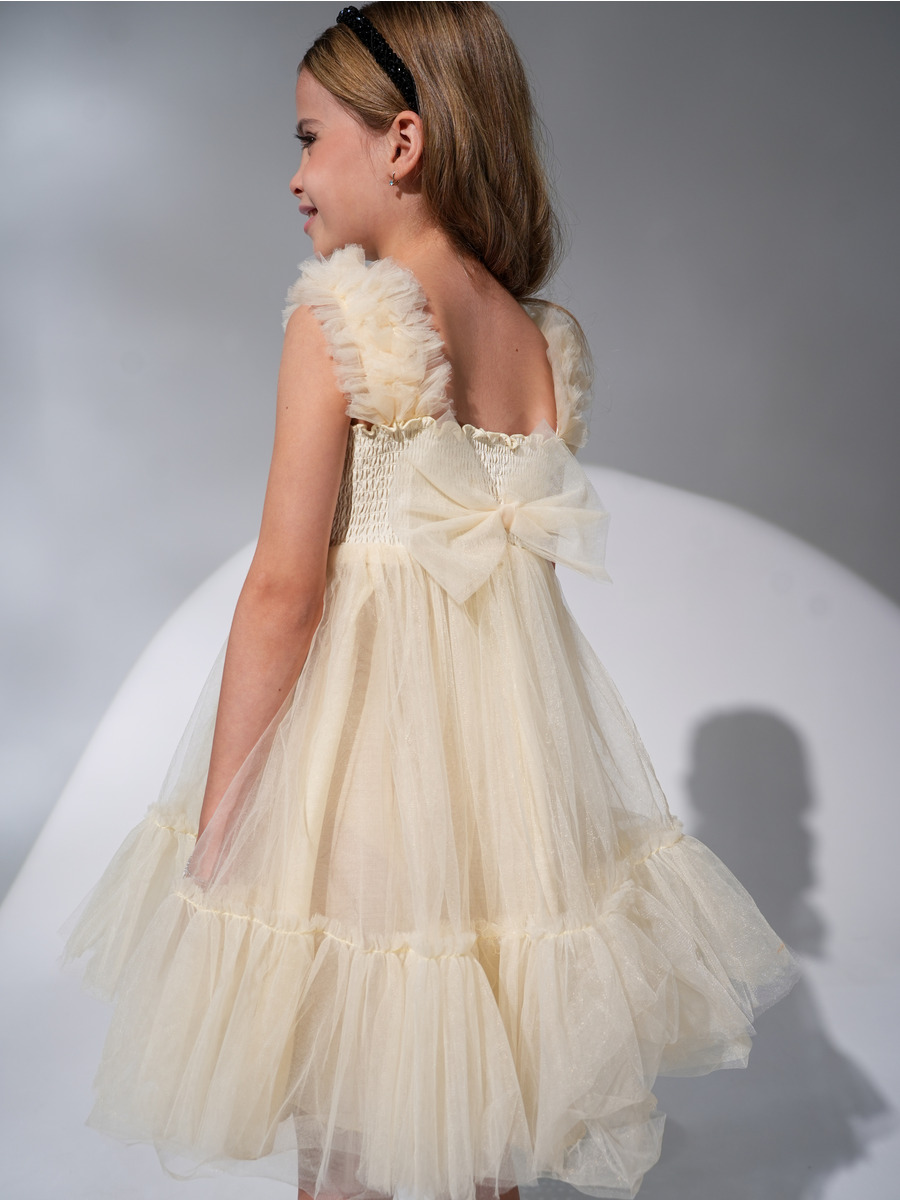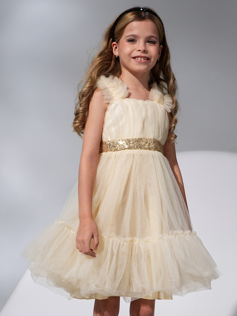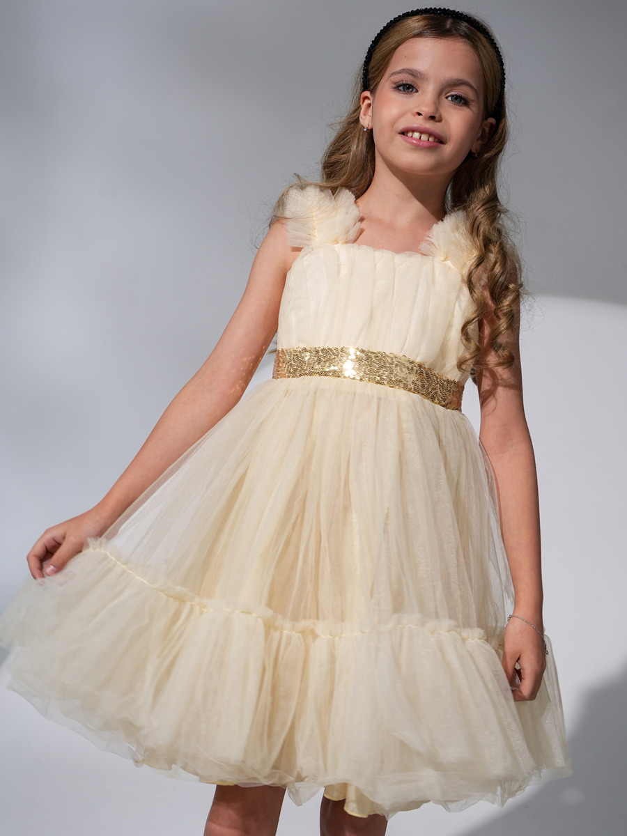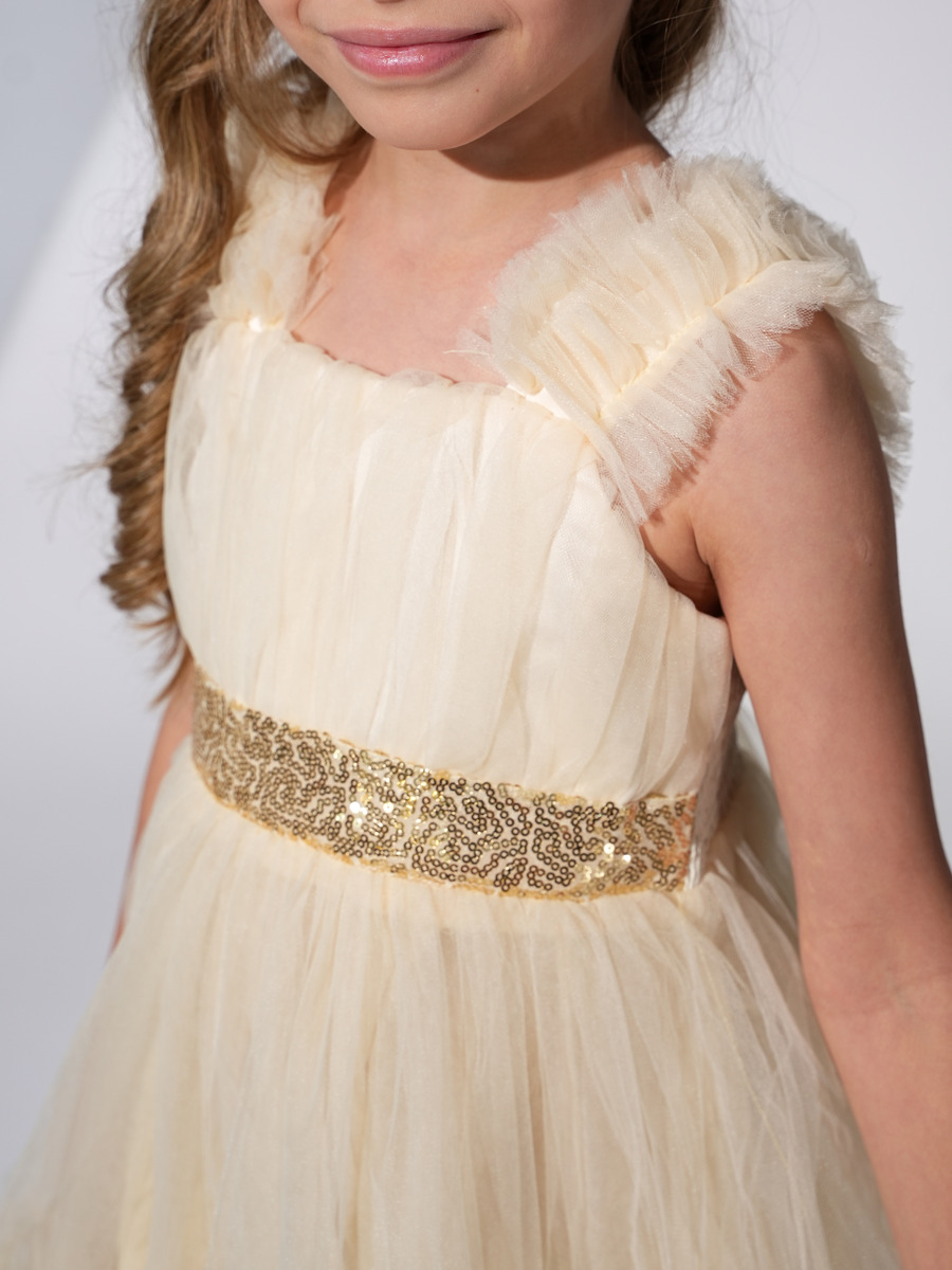 Праздничное платье из фатина идеальный выбор для девочки на выпускной, день рождения, Новый год. Платье воздушное и легкое с пышной юбкой, оборкой по низу юбки и изящными бретелями. Лиф платья выполнен из присборенного фатина, а на спинке присобран резинкой. Оригинальный пояс из пайеток на полочке очень украшает платье, на спинке модный пышный бант из фатина. Платье очень приятно к телу за счет хлопкового подклада.