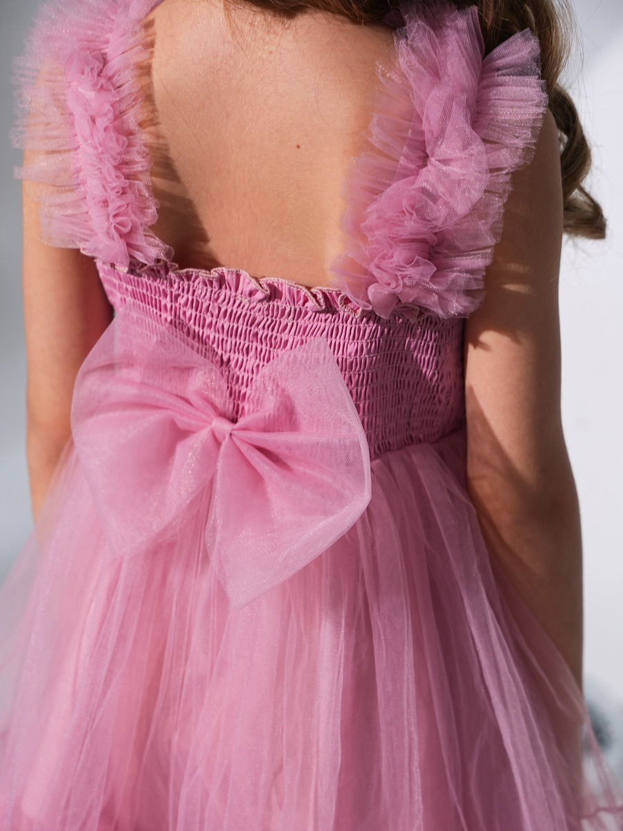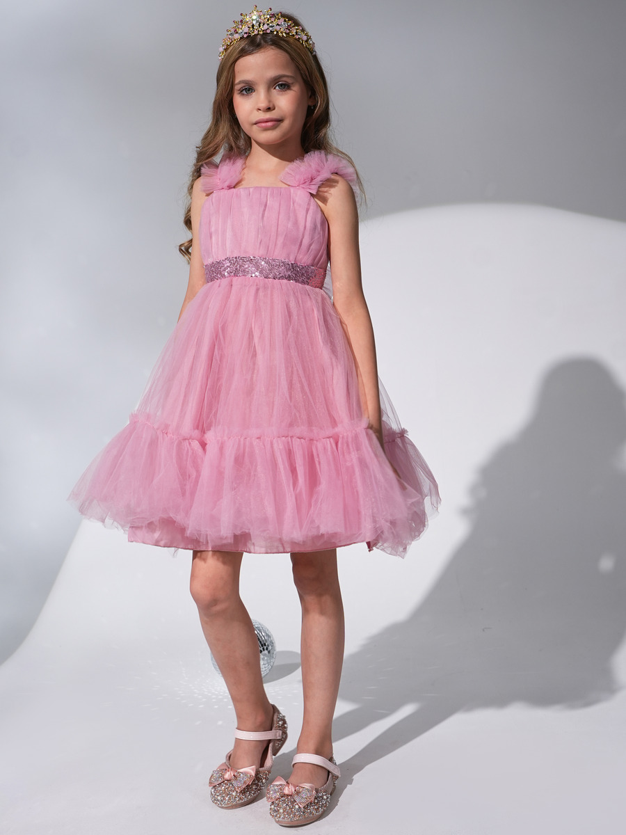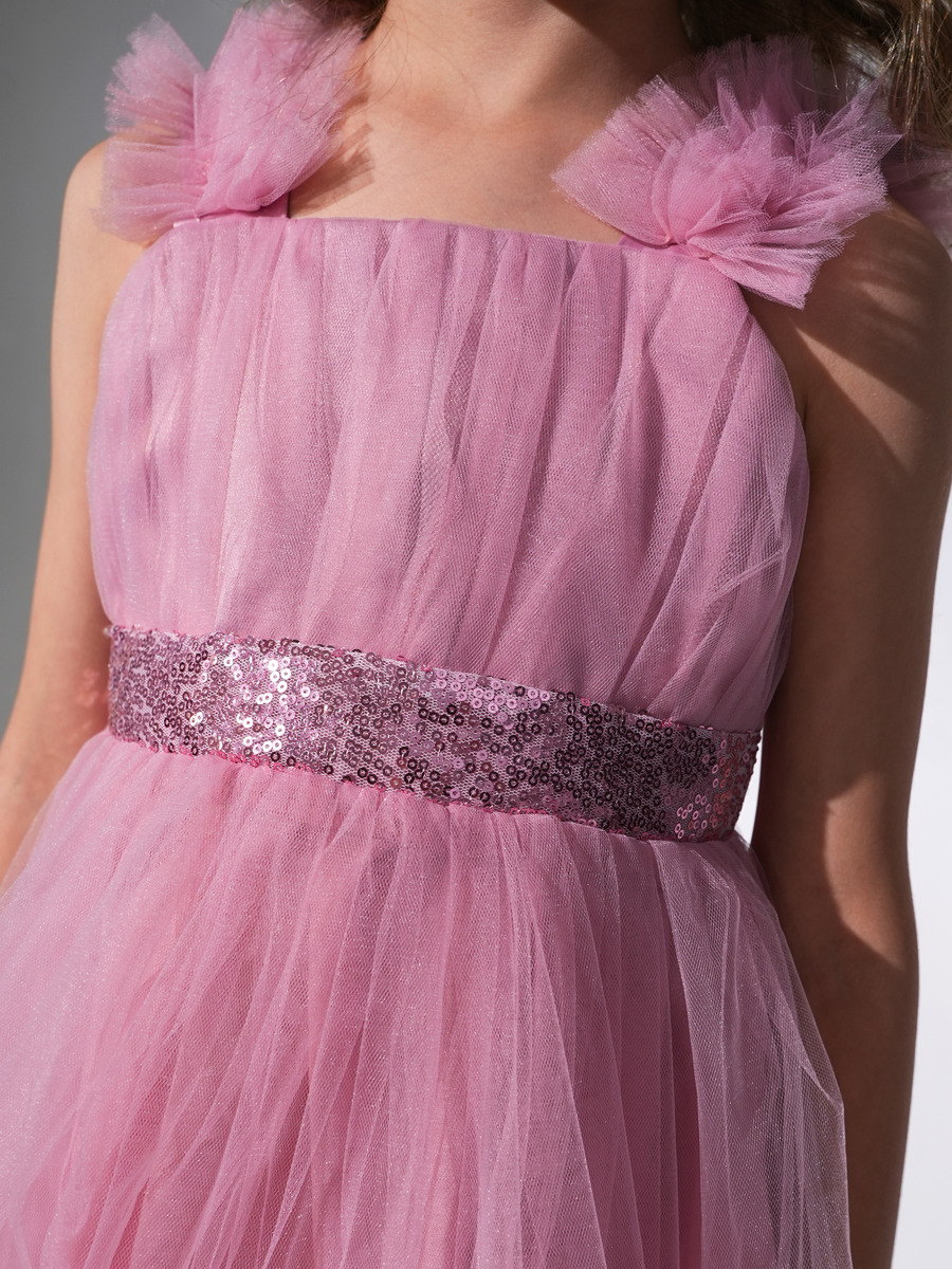 Праздничное платье из фатина идеальный выбор для девочки на выпускной, день рождения, Новый год. Платье воздушное и легкое с пышной юбкой, оборкой по низу юбки и изящными бретелями. Лиф платья выполнен из присборенного фатина, а на спинке присобран резинкой. Оригинальный пояс из пайеток на полочке очень украшает платье, на спинке модный пышный бант из фатина. Платье очень приятно к телу за счет хлопкового подклада.