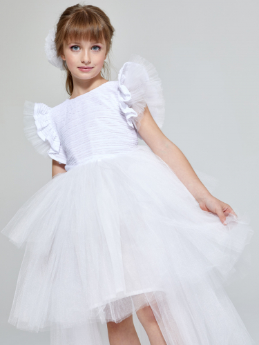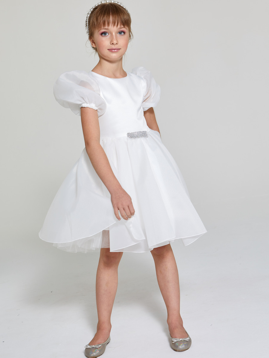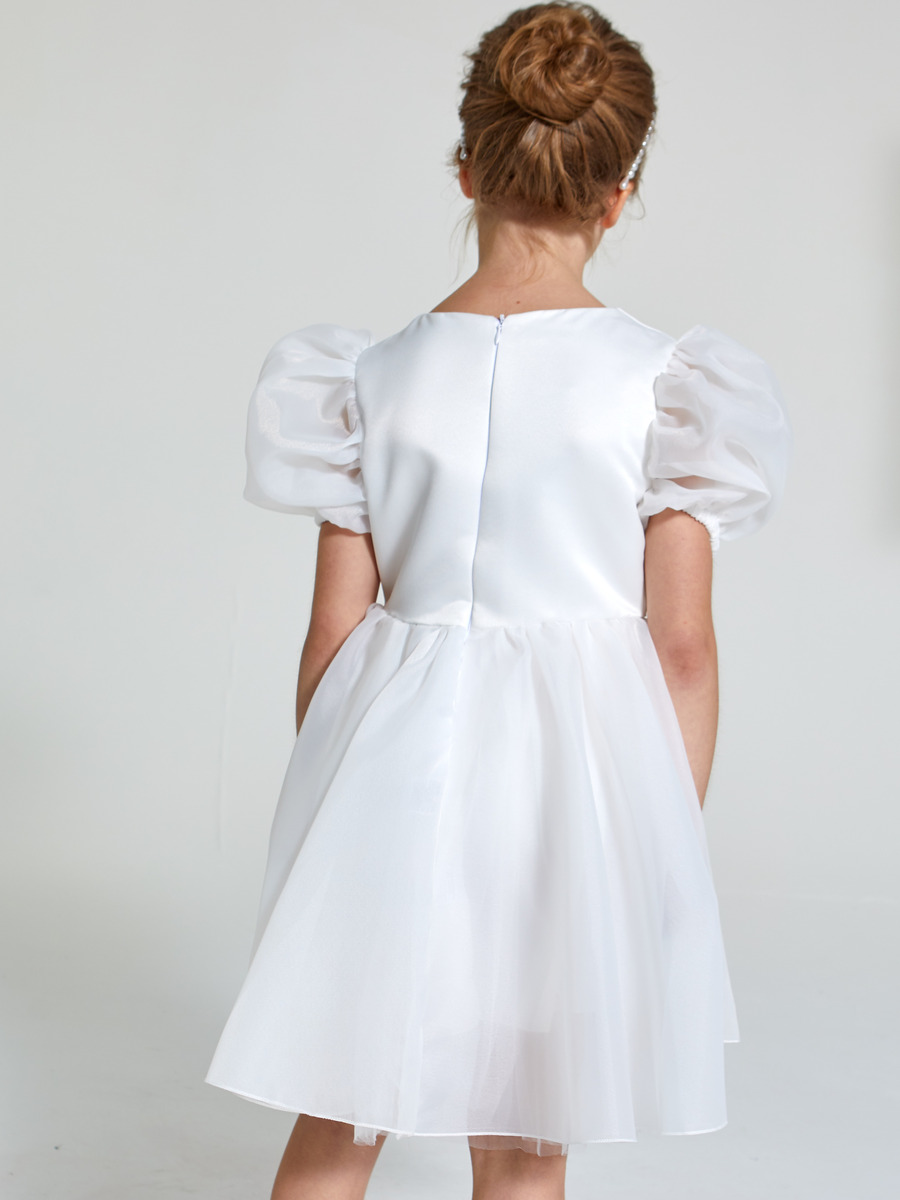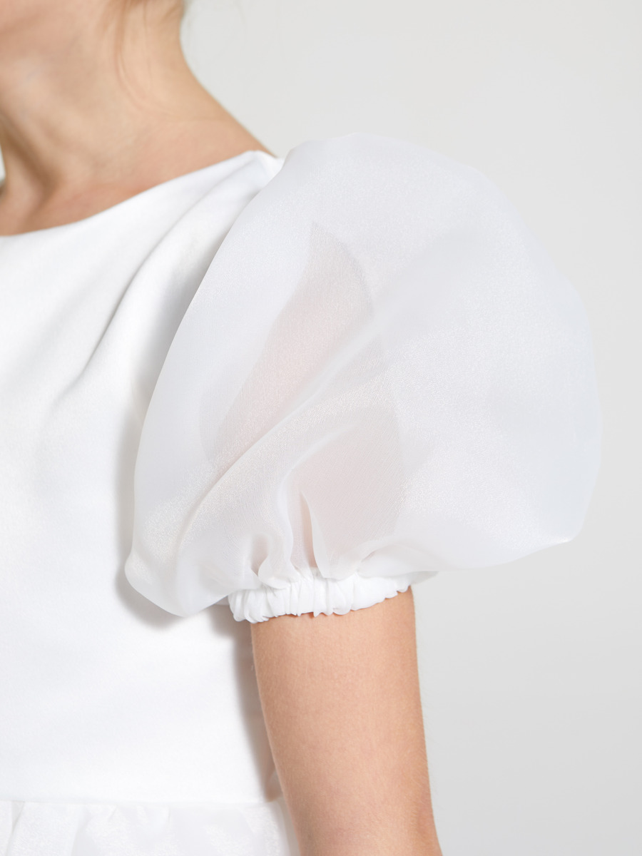 Приталенное платье с рукавами-фонариками и пышной юбкой из сетки.