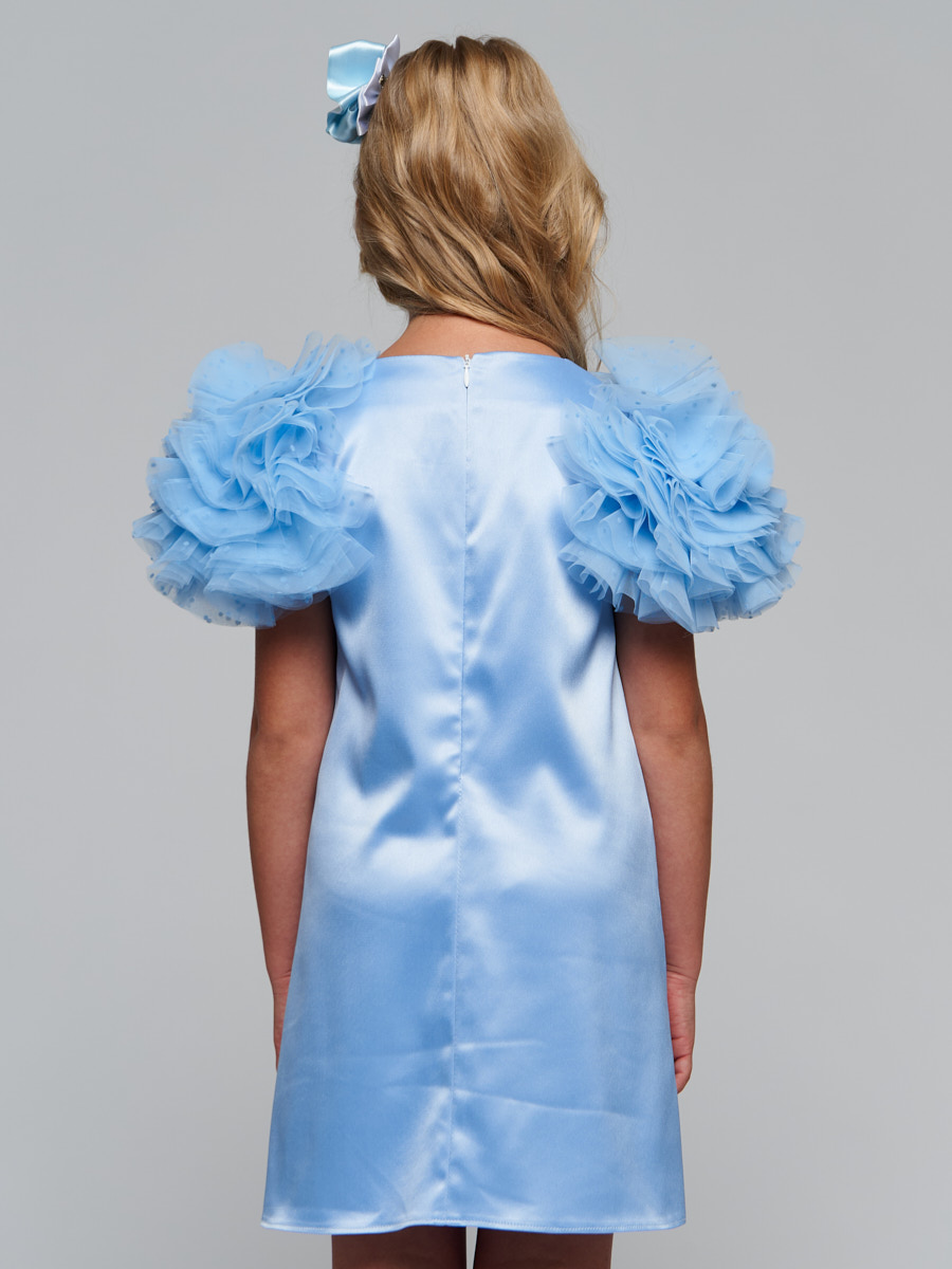 Платье из атласного материала, А образного силуэта с рукавами декорированными сеткой в форме шара.