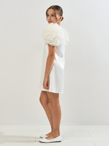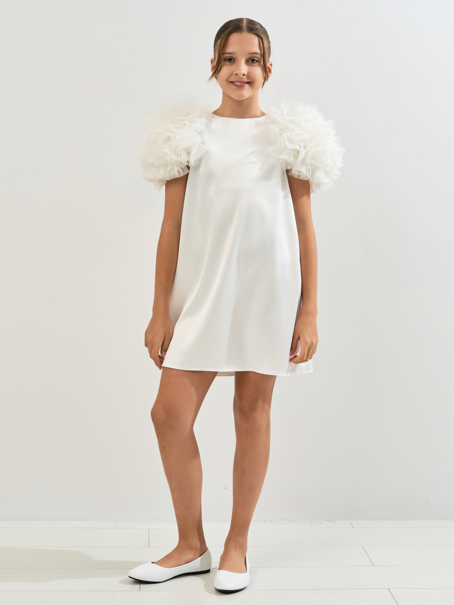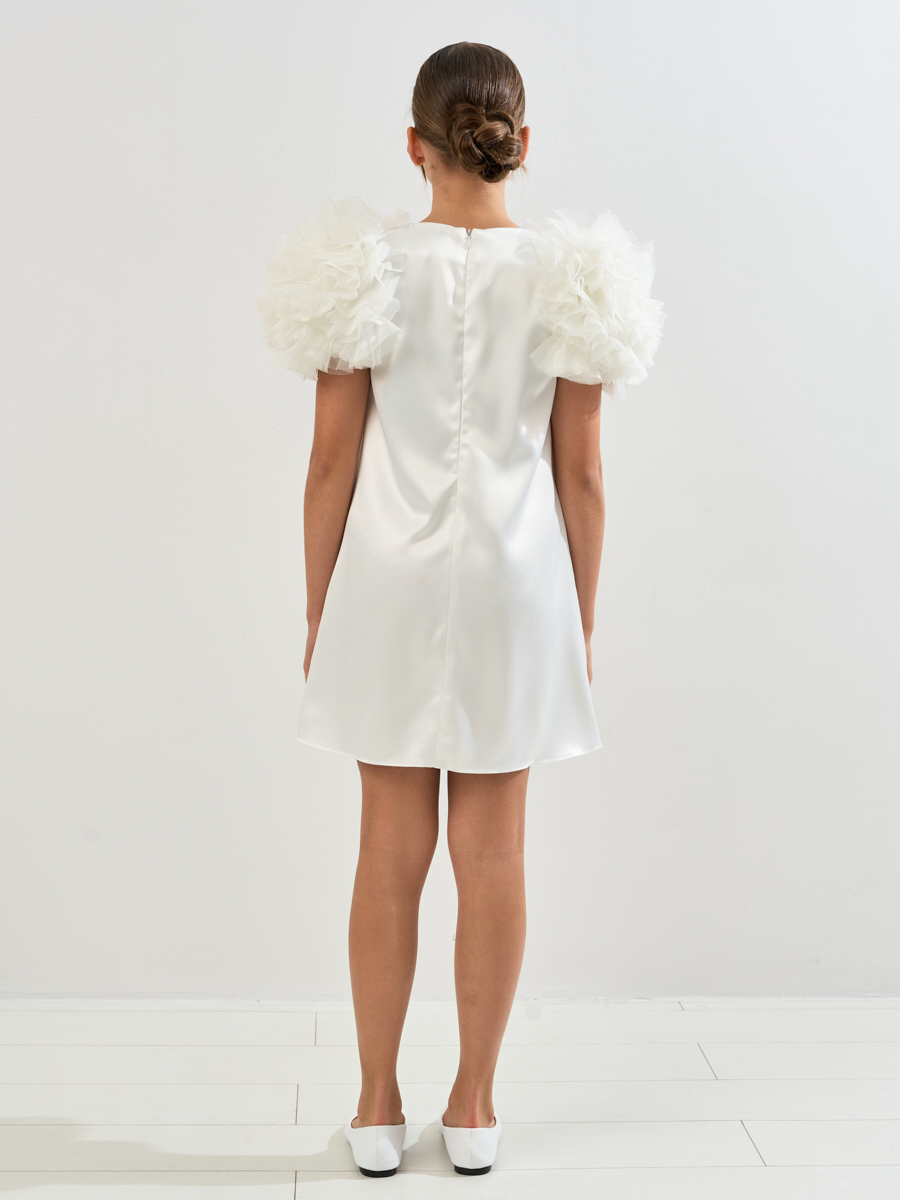 Платье из атласного материала, А образного силуэта с рукавами декорированными сеткой в форме шара.