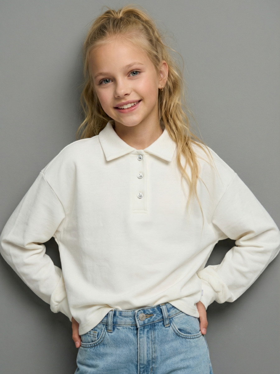 Поло для девочки с длинными рукавами из трикотажного полотна пике сводобного силуэта. С отложным воротничком. Пуговицы на манишке.