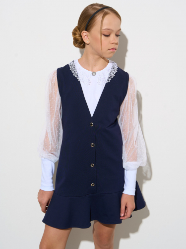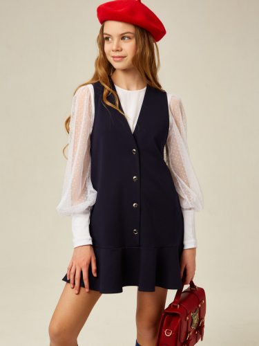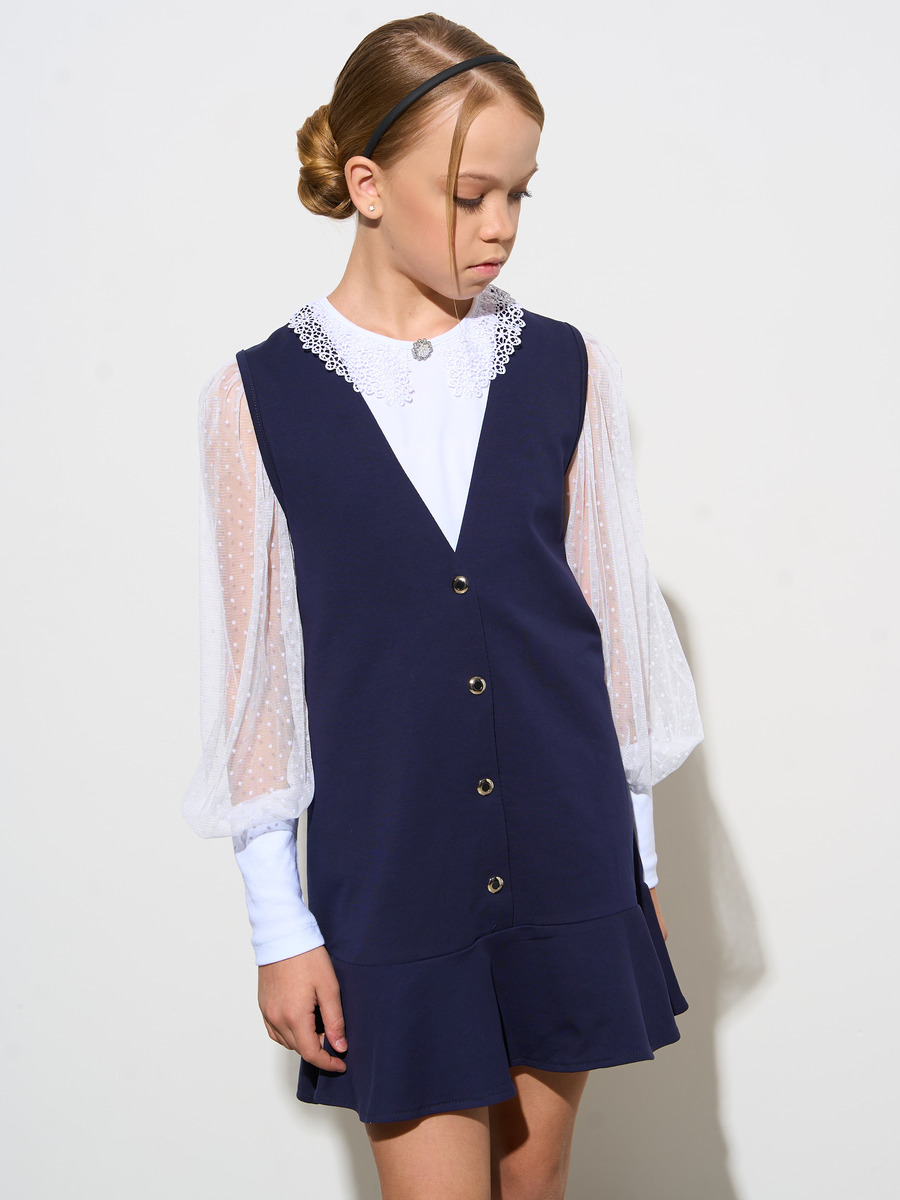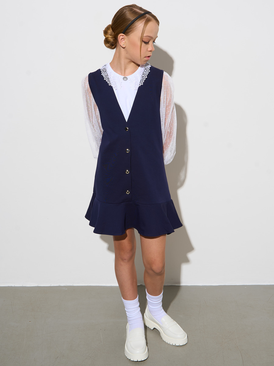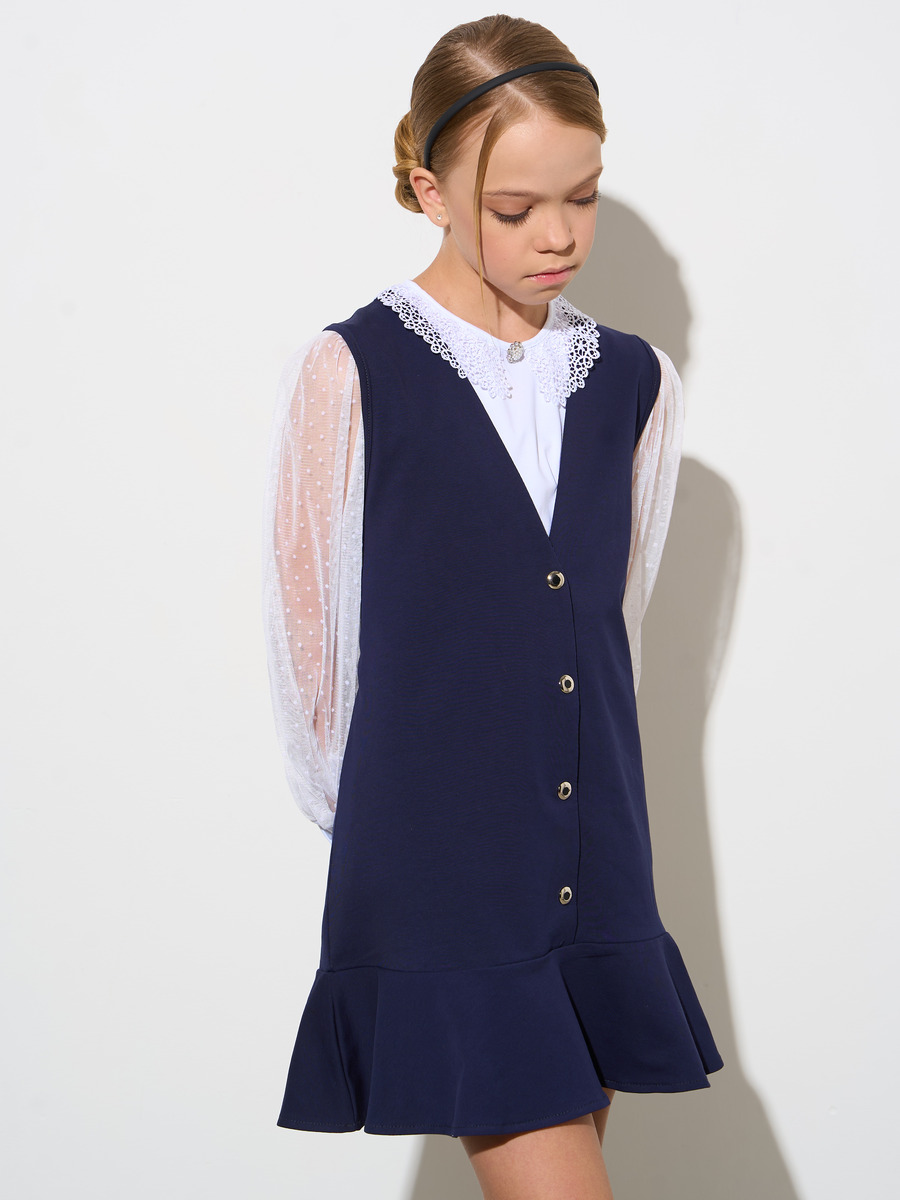 Сарафан А- силуэта из джерси, V-образная горловина. По низу волан, застежка спереди на кнопки.