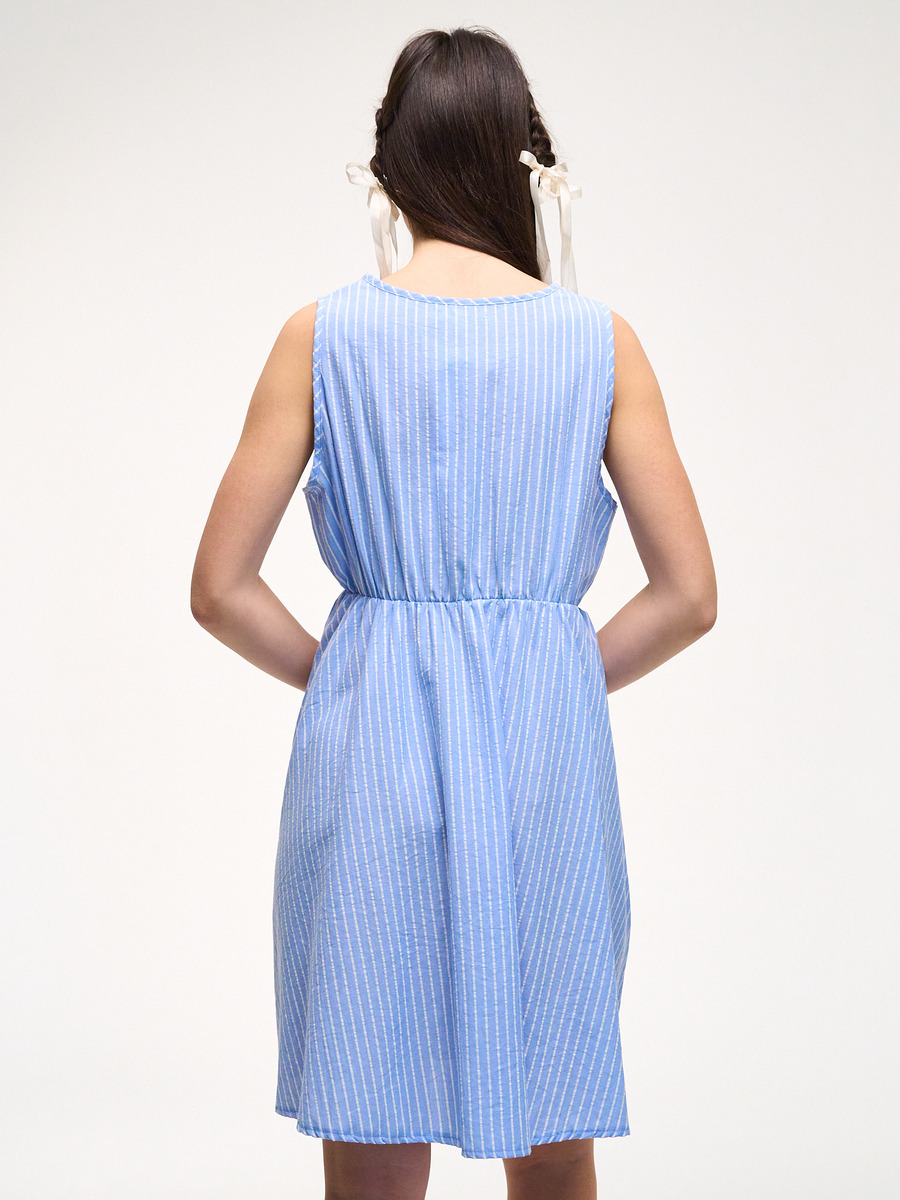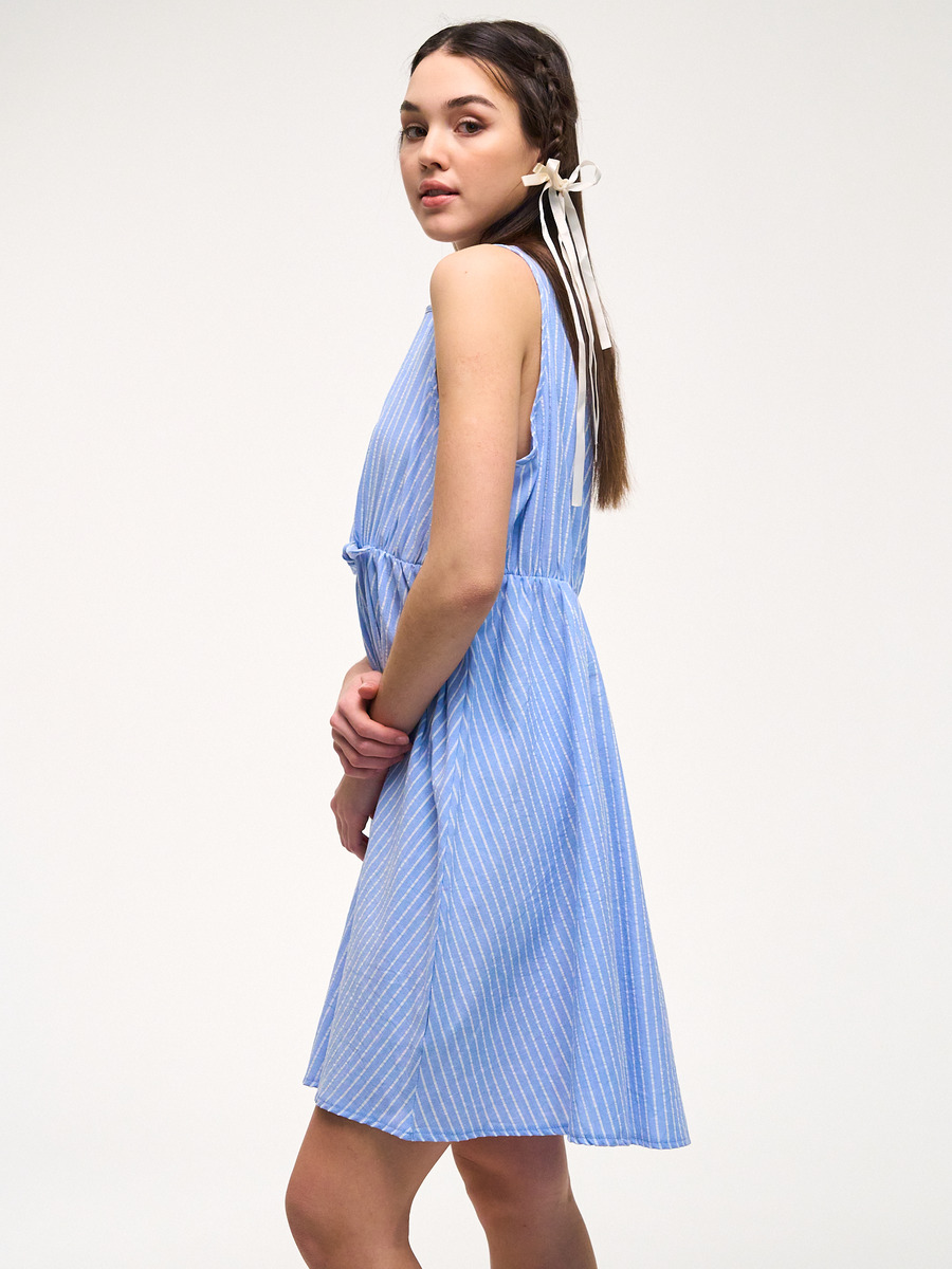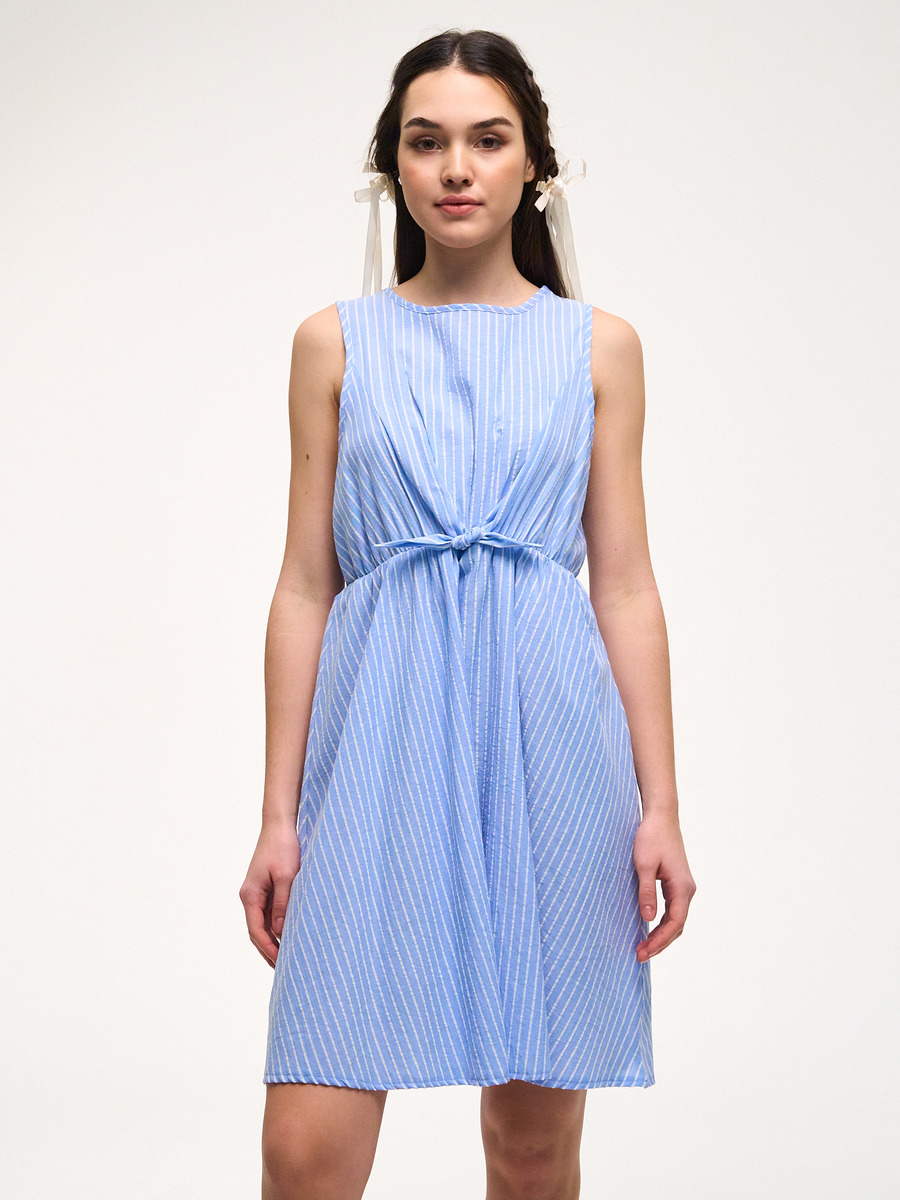 Платье из легкого натурального хлопка. Завязки на талии. Без рукавов. Свободная расклешенная юбка.