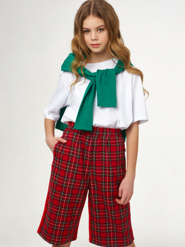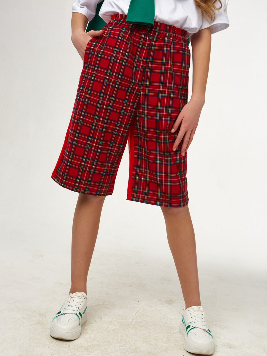 Шорты для девочки из комбинации трикотажа и текстиля, широкие, с карманами в боковых швах, с высокой талией. Передние половинки из ткани в клетку, задние половинки однотонные. Пояс широкий, с эластичной тесьмой внутри.