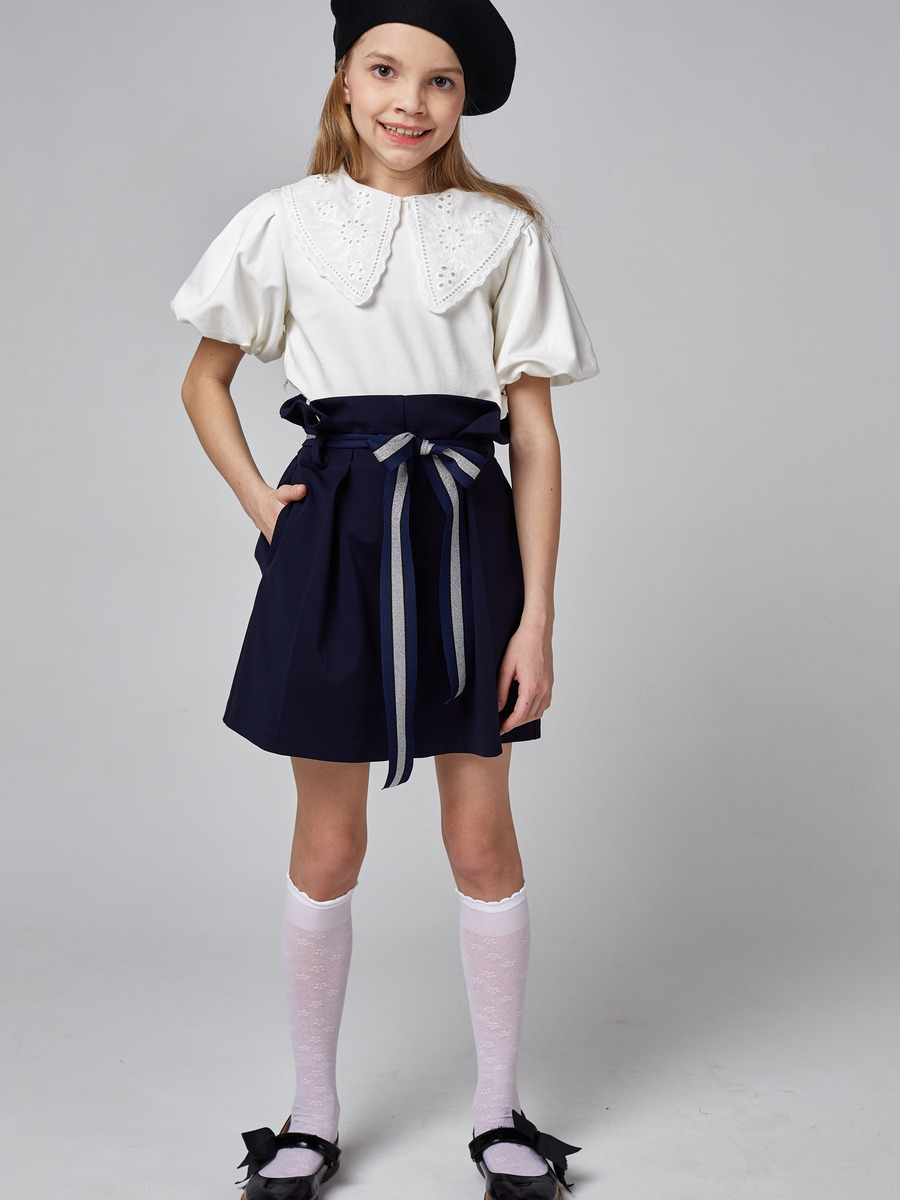 Шорты для девочки свободного силуэта из джерси. Задняя часть пояса собрана на резинку.На передней части складки, боковые карманы. Съемный пояс из ленты.