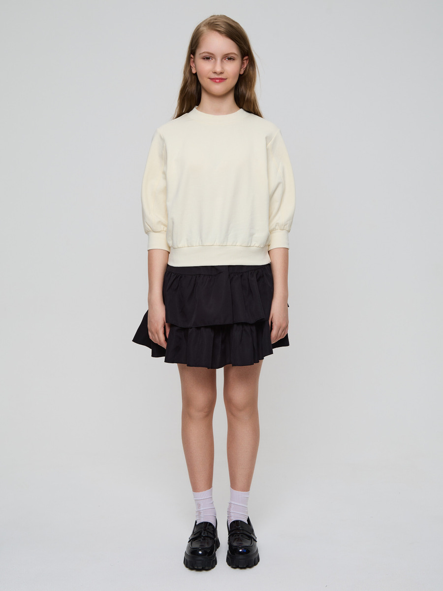 Трикотажный Свитшот из хлопкового футера с дабавлением эластана качества пенье. Свитшот для девочки свободного прямого силуэта укароченный на поясе для повседневной носки. Рукава "фонарик" втачные широкие с декоративными рельефами по всей длине, длиной 3/4, на манжете. Пояс, манжеты и планка горловины из хлопкового кашкорсе с лайкрой.Горловина округлая.