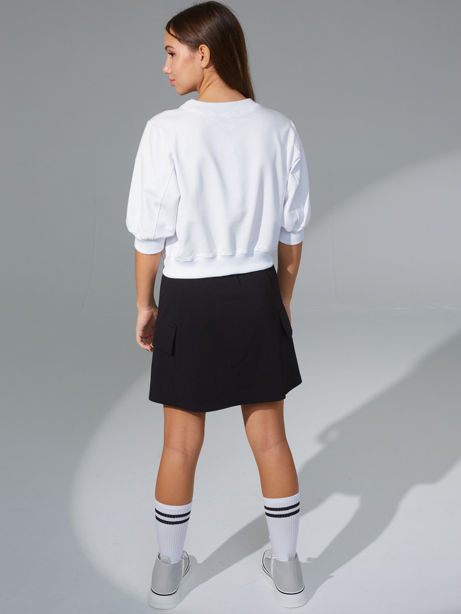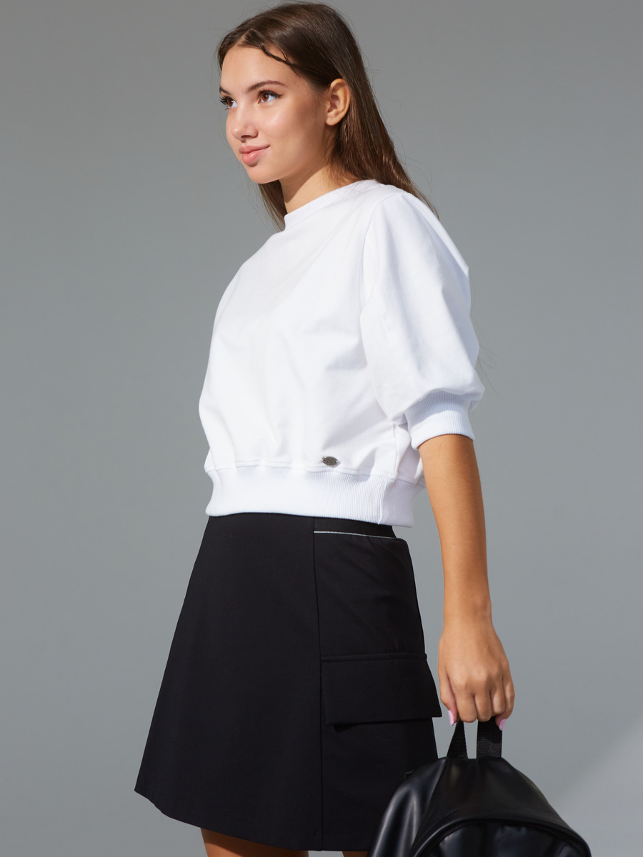 Коллекция школа 2024. Трикотажный Свитшот из хлопкового футера с дабавлением эластана качества пенье. Свитшот для девочки свободного прямого силуэта укароченный на поясе для повседневной носки. Рукава "фонарик" втачные широкие с декоративными рельефами по всей длине, длиной 3/4, на манжете. Пояс, манжеты и планка горловины из хлопкового кашкорсе с лайкрой.Горловина округлая.