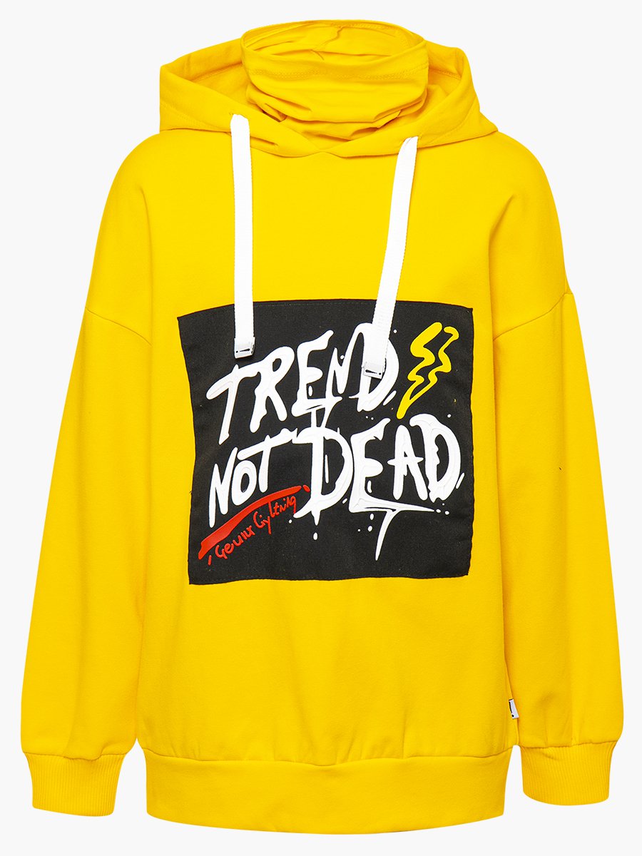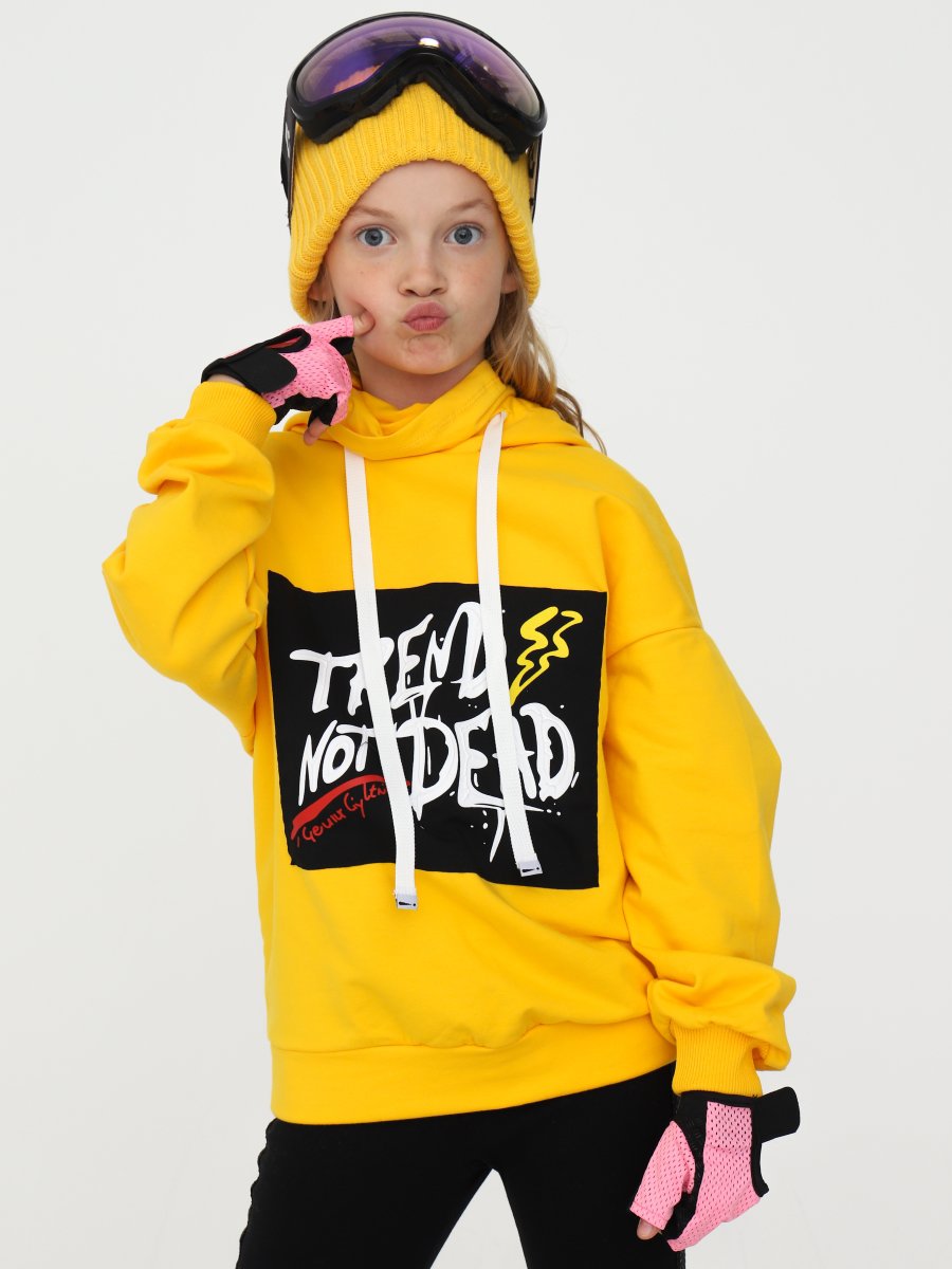 Толстовка с капюшоном свободного силуэта для девочки. На передней части нашивка. Плечо спущенное, рукав длинный с манжетой. Капюшон с имитацией маски, с контрастной средней частью. По низу пояс.