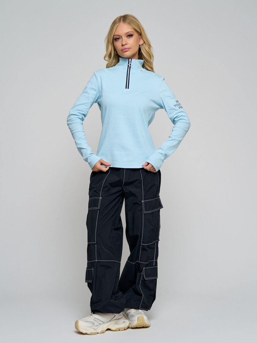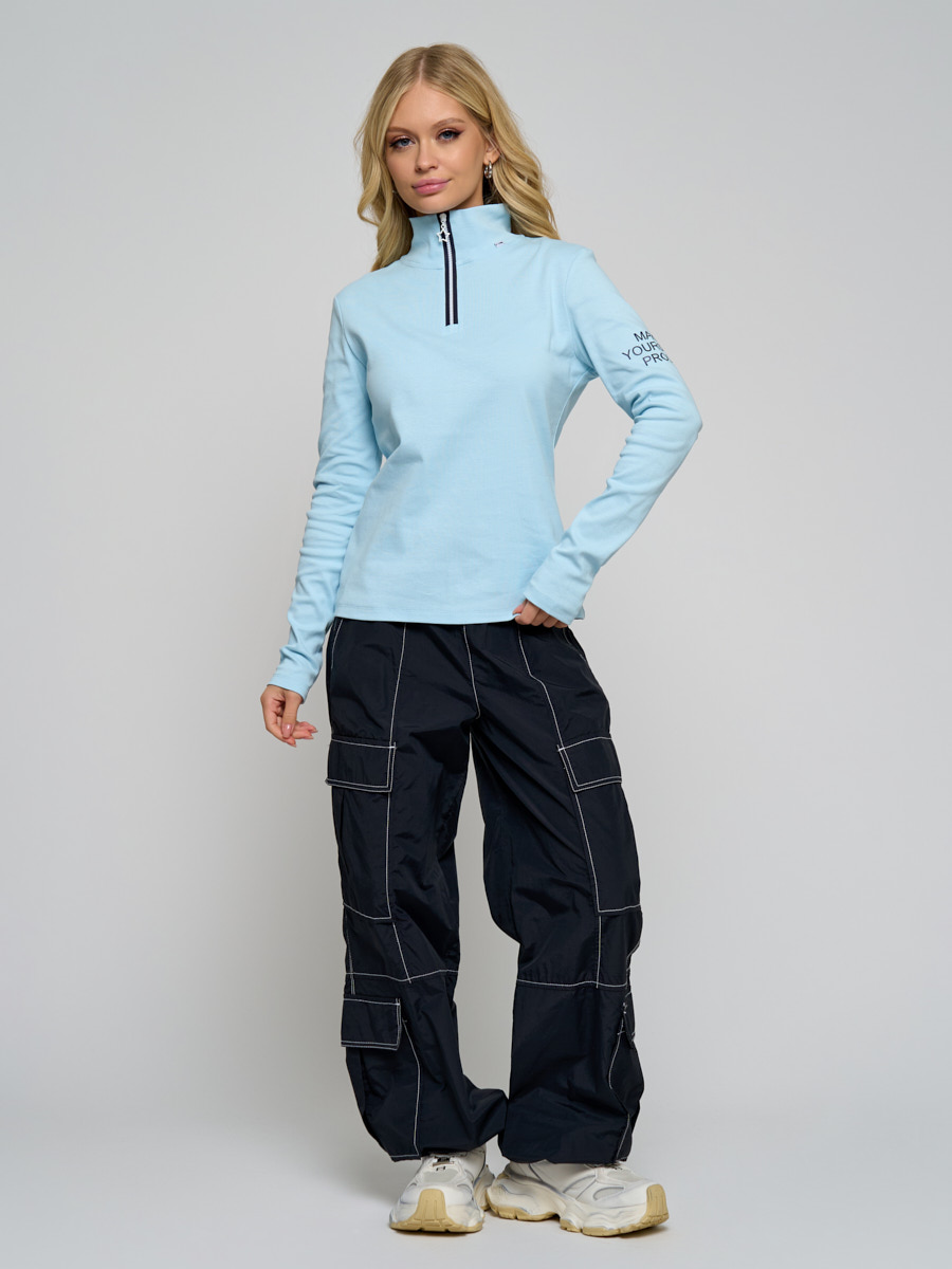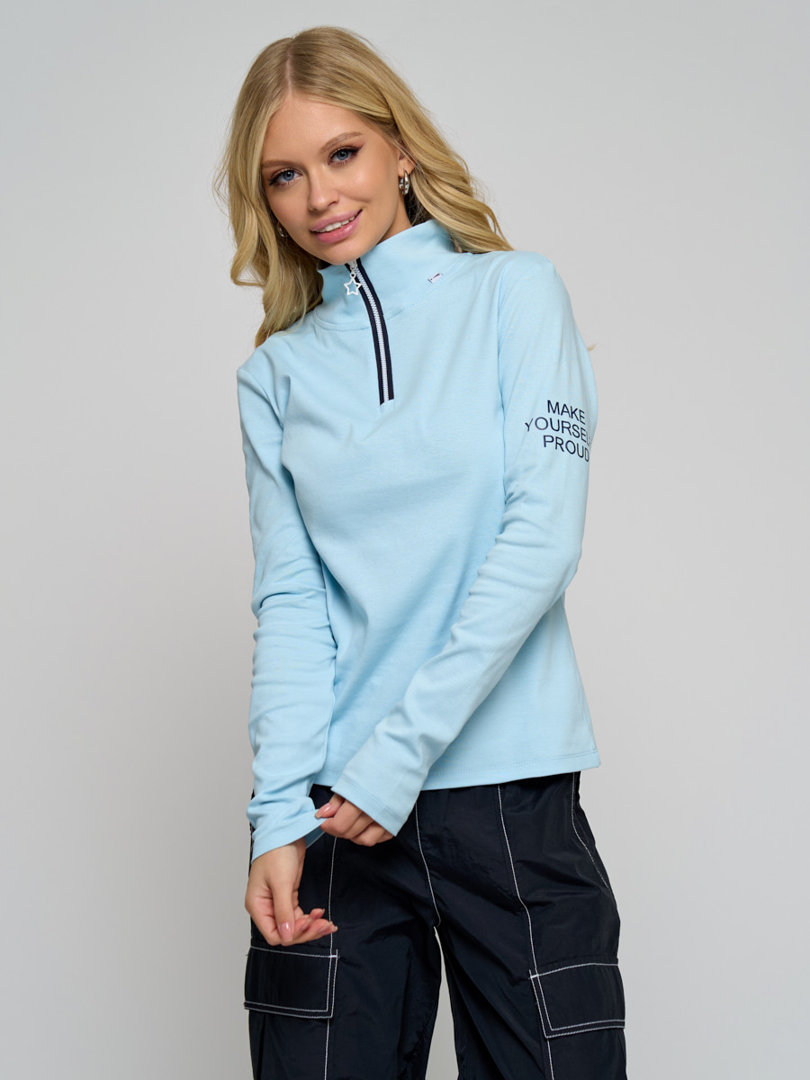 Водолазка из рибаны с лайкрой, прилегающего кроя, высокий воротник , длинные рукава, застежка на короткую молнию. Принт на рукаве.
