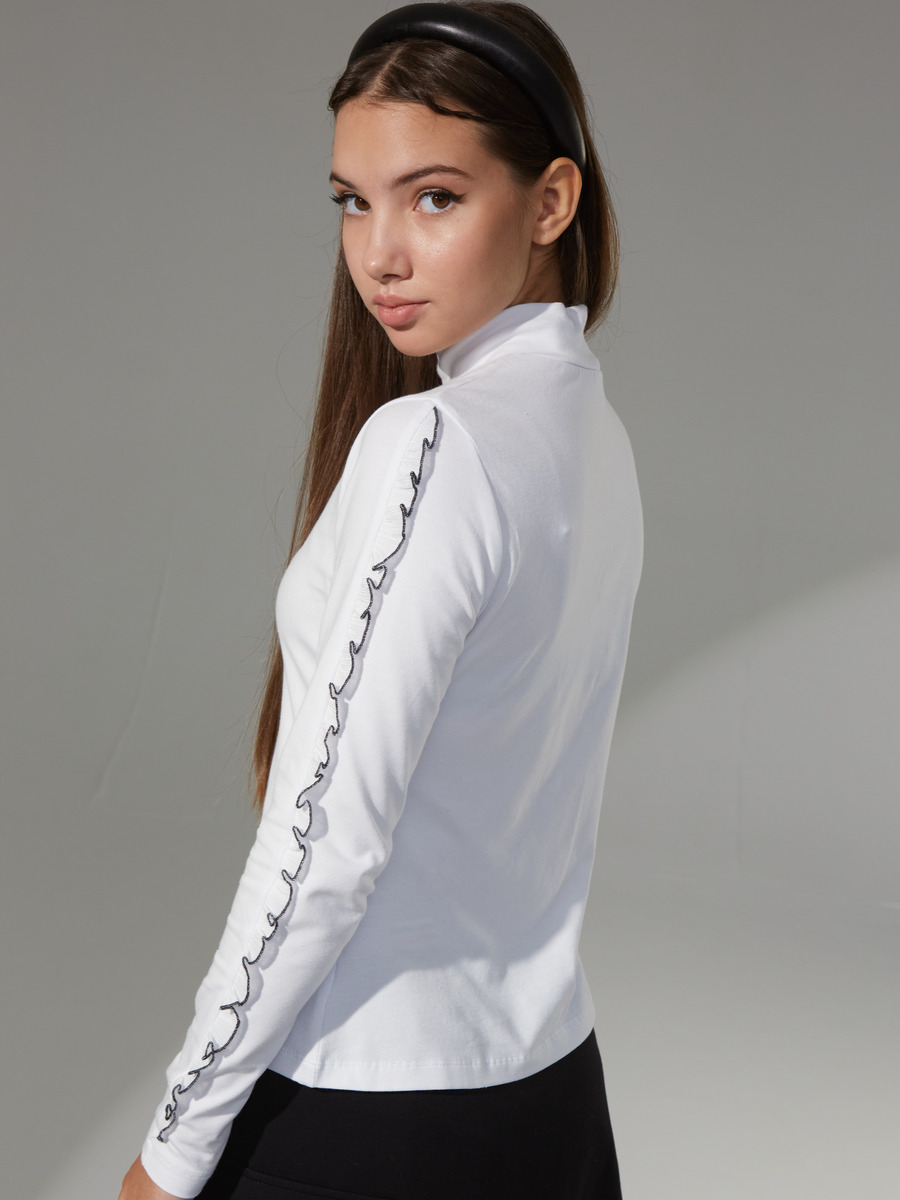 Коллекция школа 2024. Трикотажная Водолазка из хлопковой кулирки с дабавлением эластана качества пенье пл.180 гр/м2. Водолазка для девочки приталенного силуэта для повседневной носки с втачным длинным рукавом зауженным к низу. Низ рукава и низа изделия обработан эластичным швом в подгибку с нижним застилом.. Воротник стойка из хлосатобумажной рибаны с лайкрой. По всей длине рукава декорировная рюша из текстиля с контрастной отделкой.
