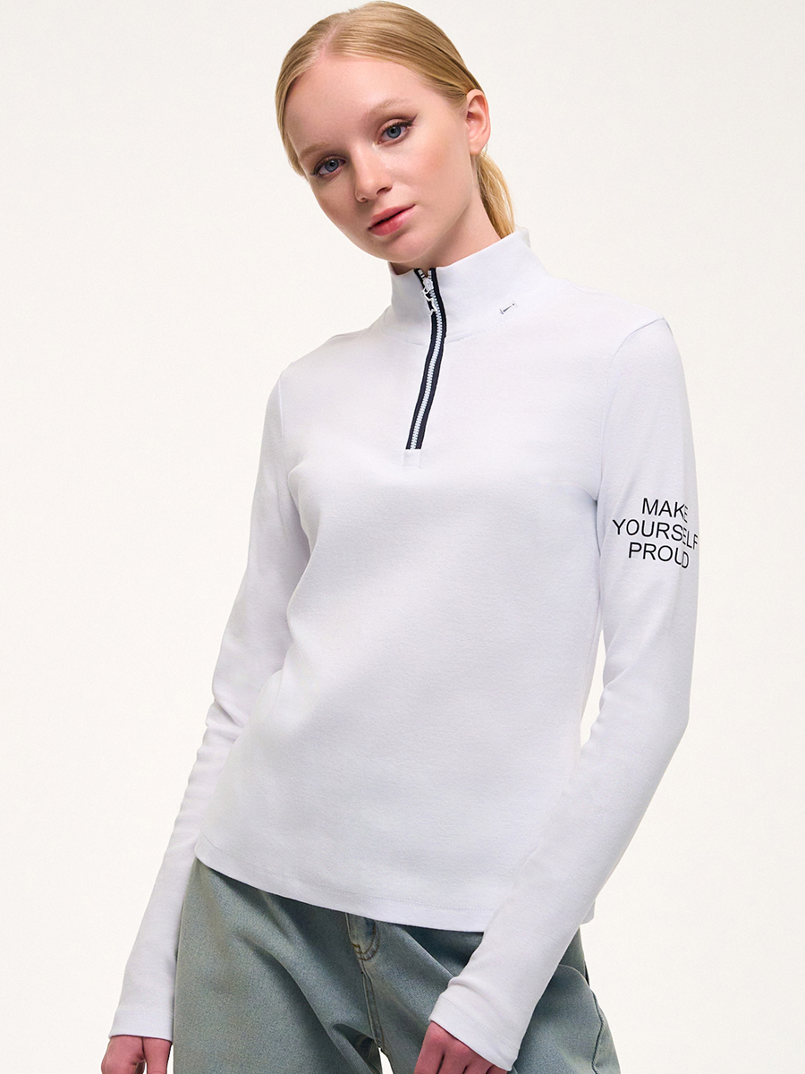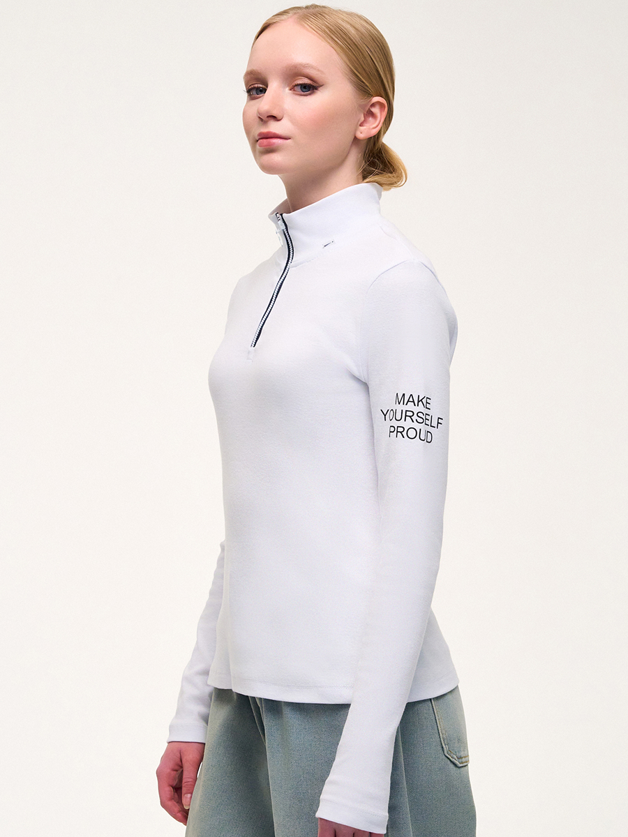 Водолазка из рибаны с лайкрой, прилегающего кроя, высокий воротник , длинные рукава, застежка на короткую молнию. Принт на рукаве.