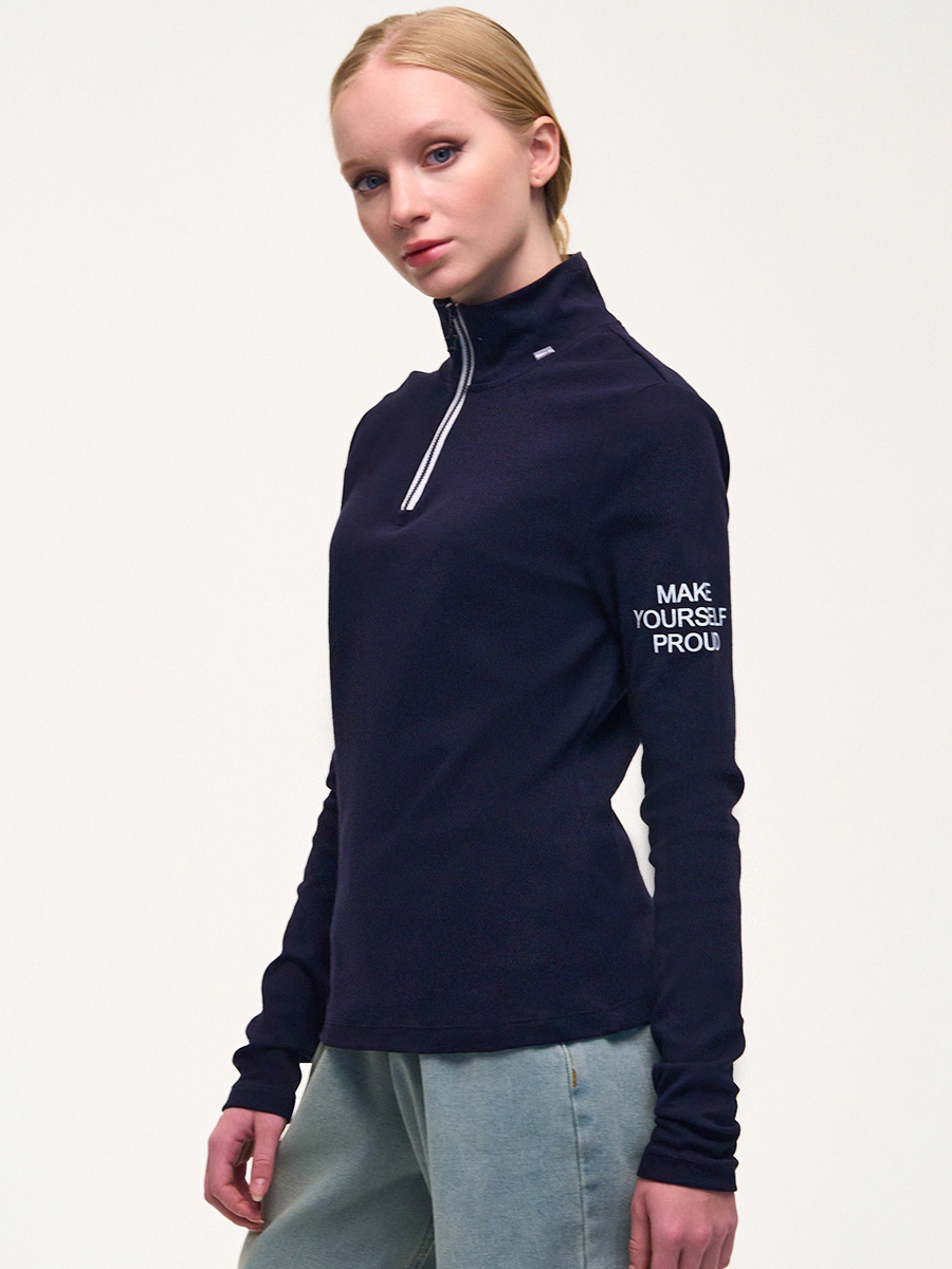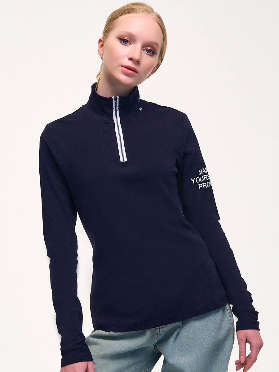 Водолазка из рибаны с лайкрой, прилегающего кроя, высокий воротник , длинные рукава, застежка на короткую молнию. Принт на рукаве.