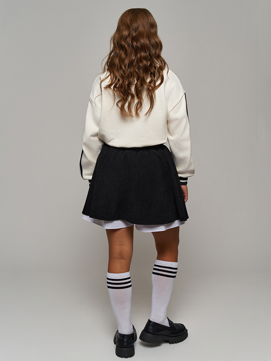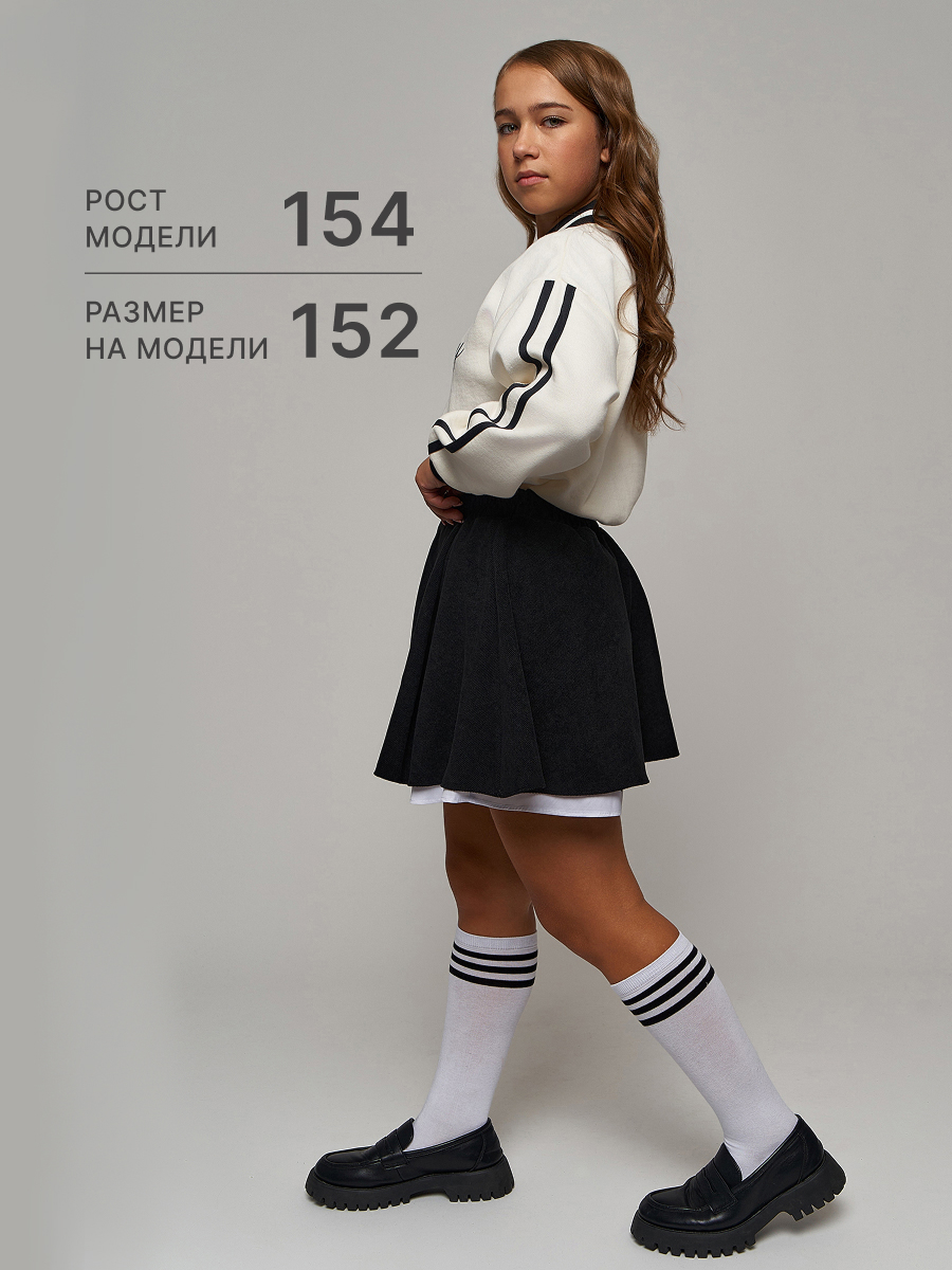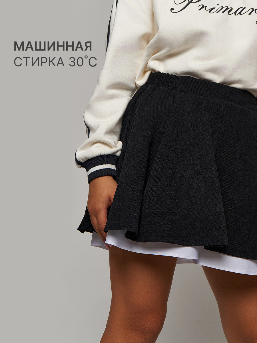 Юбка-шорты из вельвета А-силуэта, расклешенная к низу. Подкладка из хлопкового полотна. Пояс с эластичной резинкой.