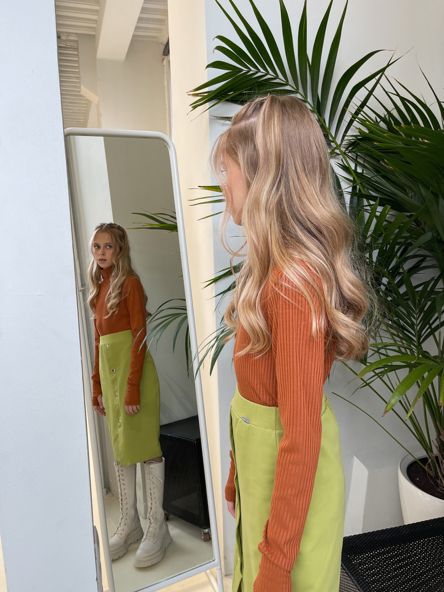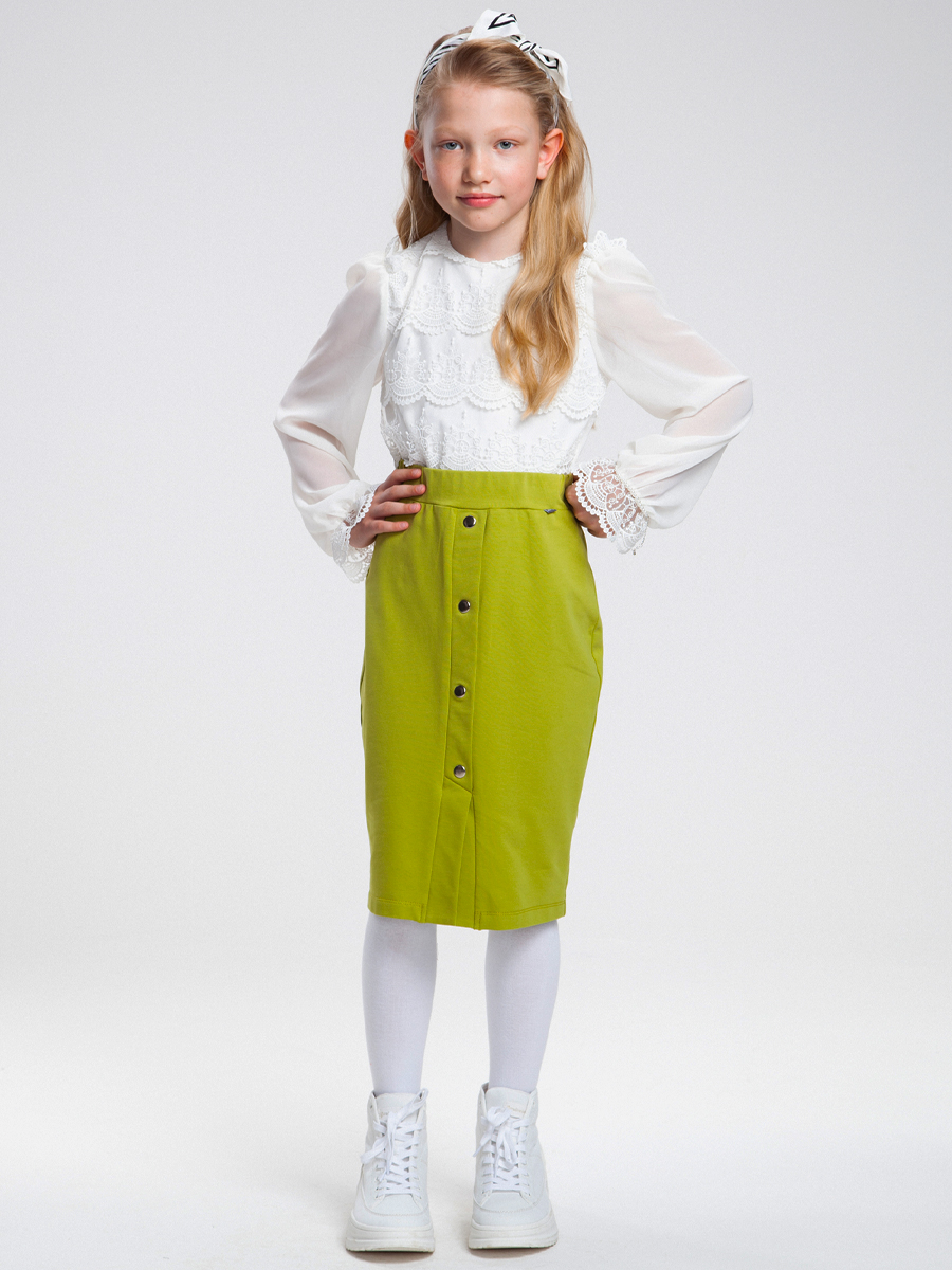 Юбка облегающая бедра, эластичный пояс, разрез спереди.