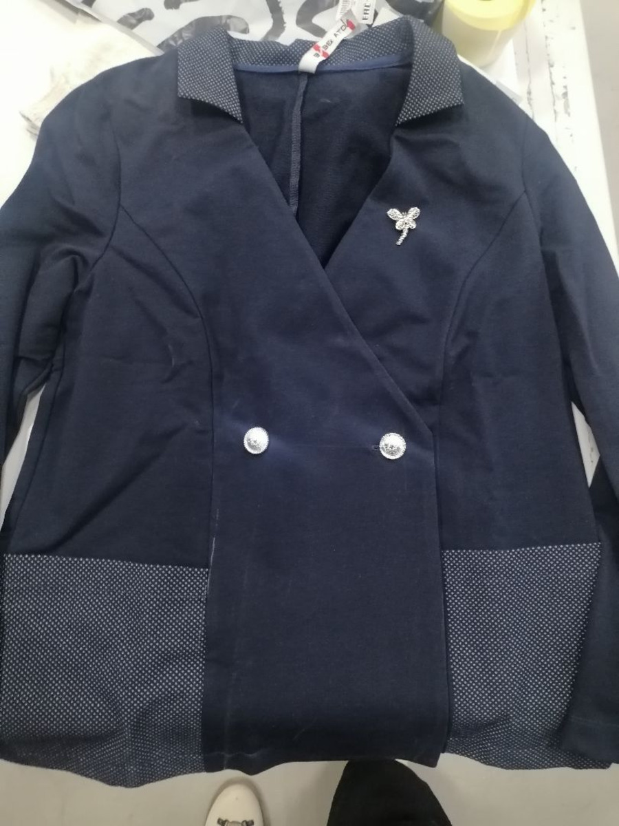 Жакет для девочки из трикотажного и тектильного полотен, полуприлегающего силуэта, двубортное, с отложным воротником и лацканами, длинными втачными рукавами. На полочке накладные карманы.