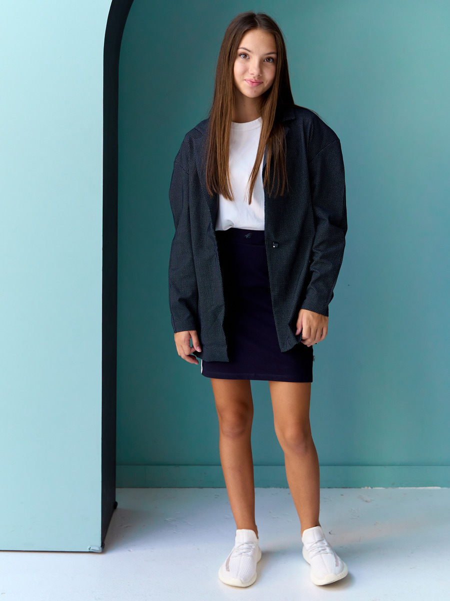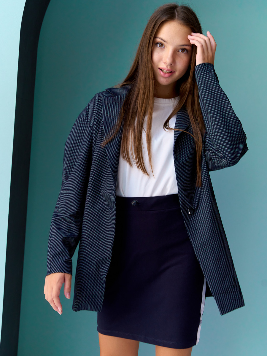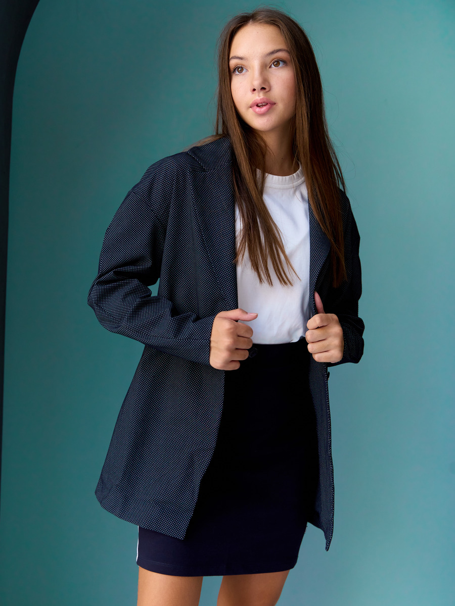 Жакет для девочки из текстиля прилегающего силуэта, с втачными рукавами рубашечного покроя, отложным воротником, с лацканами. Застежка на 1 пуговицу.