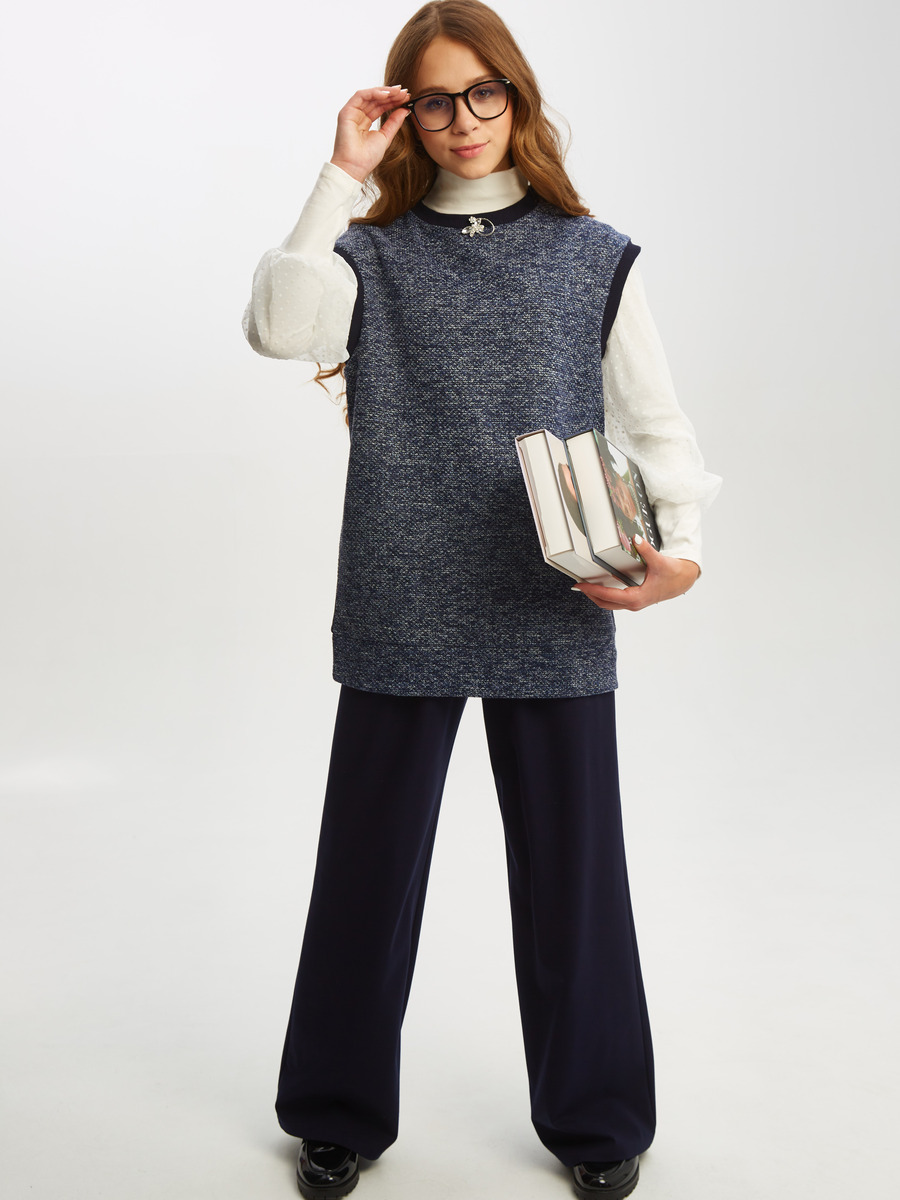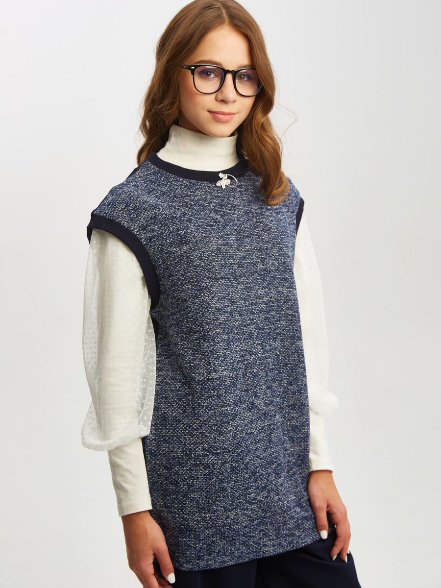 Жилет для девочки прямого силуэта из трикотажа, удлиненный, горловина круглая. По низу притачной широкий пояс.