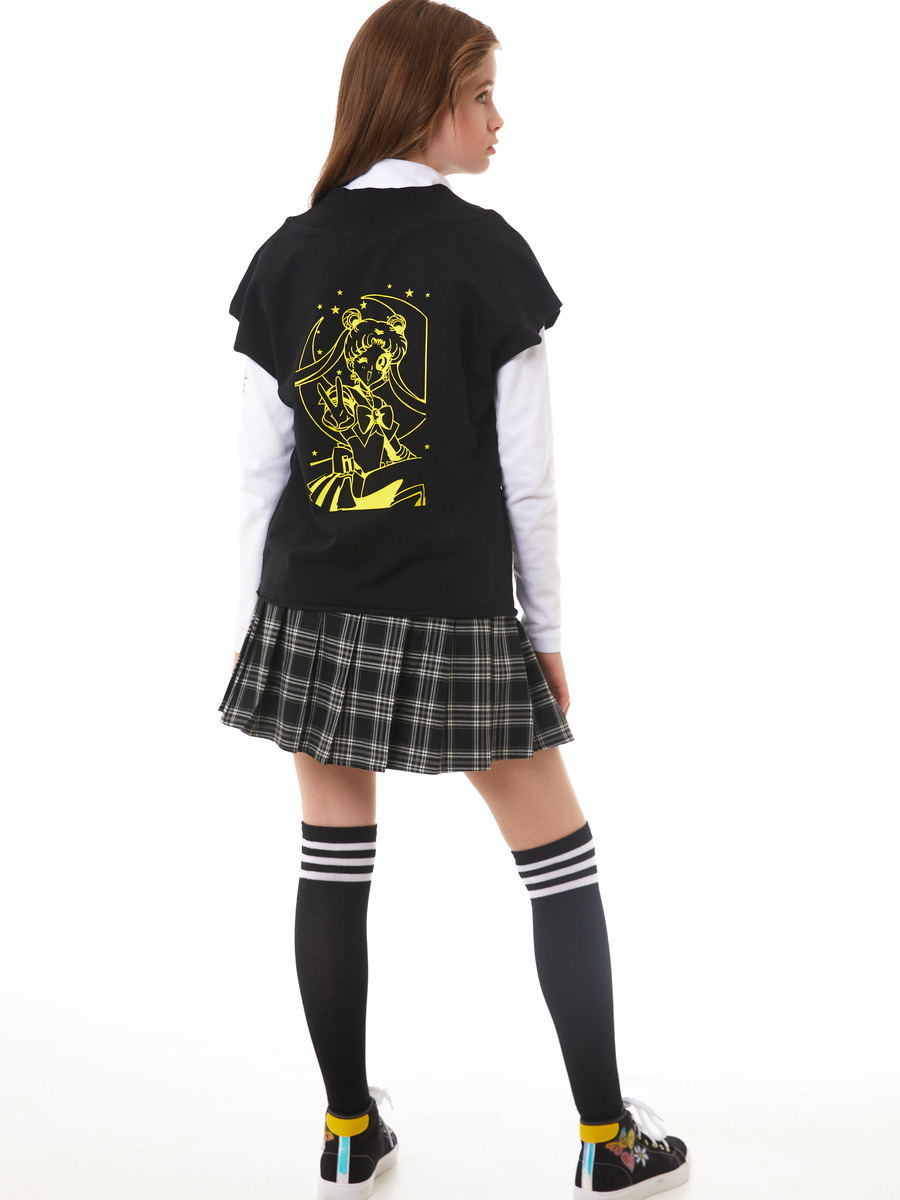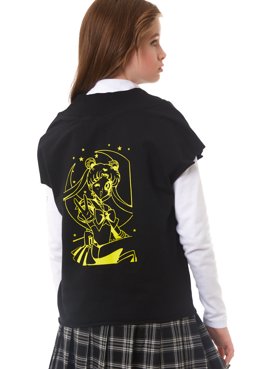 Жилет из трикотажного полотна, прямого силуэта, со спущеной линией плеча, грубоким V-образным вырезом горловины. Срезы пройм и низа не обработаны. Принт на спинке.