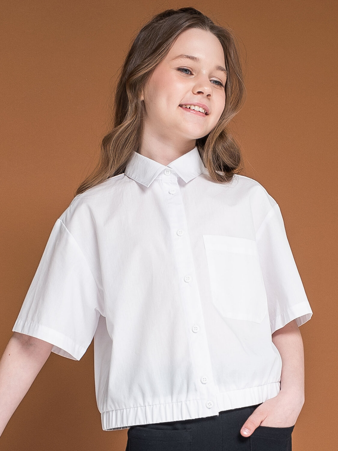 Школьная укороченная блузка свободного силуэта для девочки. Имитация кроп-топа - самого актуального силуэта. В составе ткани преобладает хлопок — модель мягкая, тактильно приятная и пропускает воздух. Благодаря полиэстеру изделие сохраняет форму и отличный внешний вид. По переду слева накладной карман — модный трендов сезона. По низу изделия резинка, которая создаёт стильный и аккуратный объём. Кроп-блузка модного оверсайз-силуэта подходит для девочек с разными типами фигуры. Красивая и практичная блузка — отлично сочетается как с брюками, так и с юбками. Прекрасный вариант школьной одежды для девочек. Идеально белый цвет без желтого и серого оттенка.