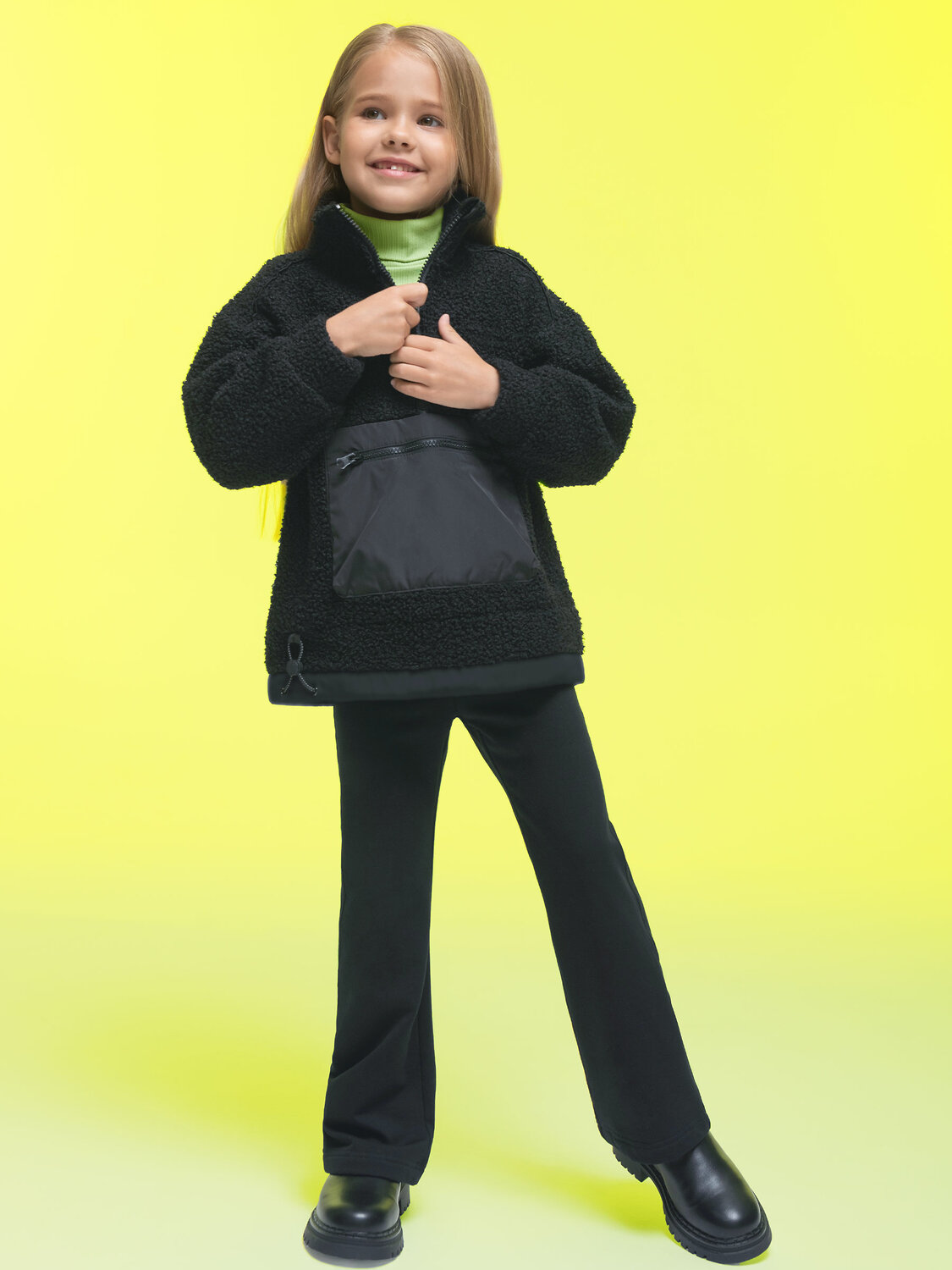 Брюки клёш для девочки из футера с начесом. Трендовые брюки-буткат подарят ребёнку свободу движений и ощущение комфорта и уюта. Одна из наиболее актуальных моделей сезона — штаны, плотно прилегающие на бёдрах и расклешённые от колена. Широкая резинка в поясе не давит и не перекручивается. С помощью шнурка со стоппером в поясе можно регулировать объём и посадку брюк. Изделие однотонное, без принта. За брюками легко ухаживать. В составе ткани (эластичный трикотаж) преобладает высококачественный хлопок — штаны тёплые, мягкие и прекрасно пропускают воздух — кожа ребёнка дышит. Благодаря эластану изделие хорошо тянется и при этом сохраняет отличную форму в течение длительного времени. Брюки детские выполнены в классическом чёрном цвете. Они легко комбинируются с различными футболками, джемперами, толстовками, куртками. В линейке представлены следующие размеры: 2 (92): 3 (98): 4 (104): 5 (110): 6 (116): 7 (122): 8 (128): 9 (134): 10 (140): 11 (146). Замечательные брюки на девочек дошкольного и младшего школьного возраста, а также девочек-подростков. Брюки клёш чёрные идеальны для детского сада, школы, прогулок, отдыха, а также для дома. Подходят для круглогодичной носки: в прохладную погоду летом, осенью, зимой, весной и демисезон. Детские брюки для девочки — стильный и практичный подарок дочери, внучке или сестре на Новый год и любой другой праздник.