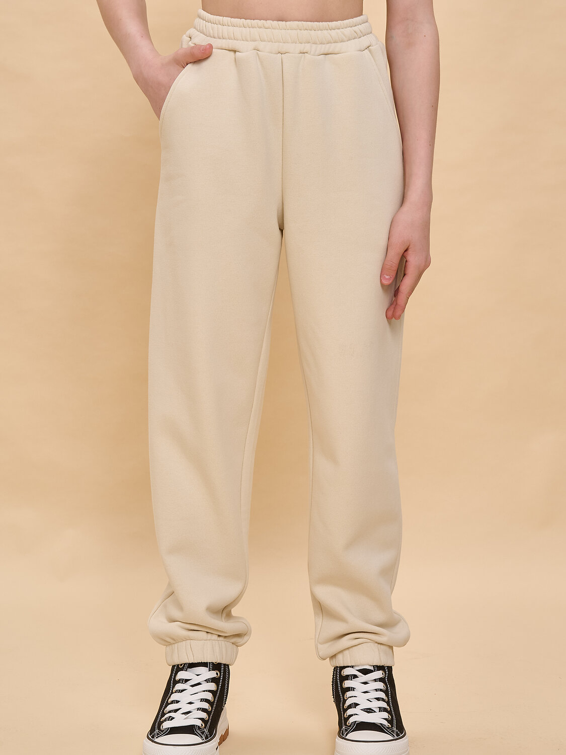 Брюки из смесового футерованного полотна с начесом. Cвободного силуэта. Боковые карманы. Низ собран на внутреннюю эластичную резину. Регулировка пояса внутренним шнуром