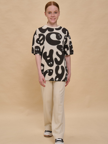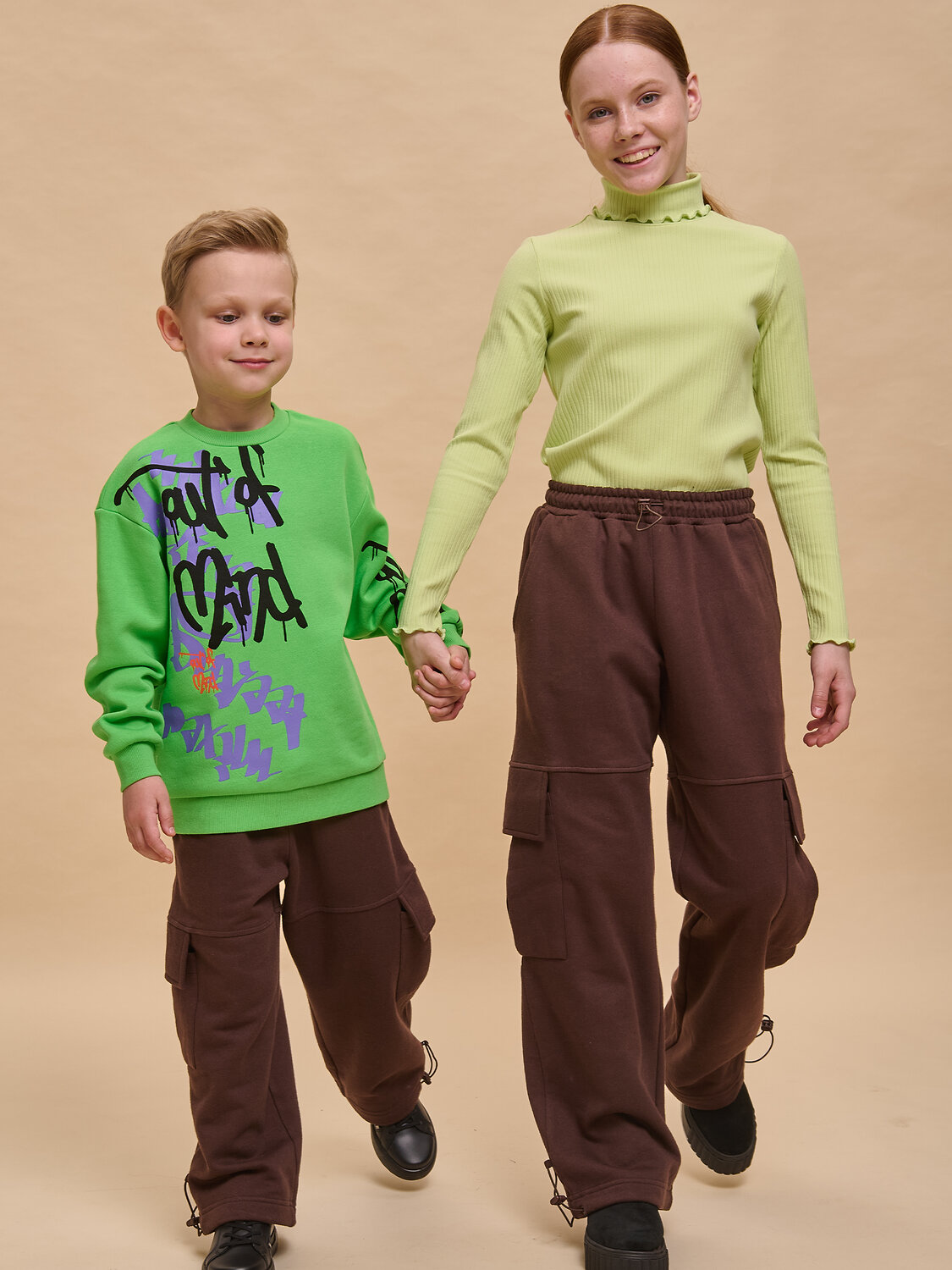 Унисекс. Брюки-карго из смесового футерованного полотна с начесом. Брюки свободного кроя с боковыми и накладными карманами. Для придания объема на накладном кармане выполнена бантовая складка, вход в карман закрыт клапаном. На уровне расположения карманов выполнены подрезы, в которые входит верхний край клапана. Пояс из основного материала с прострочкой и регулировкой ширины с помощью эластик корд и стоппера. По низу брюк предусмотрена регулировка ширины с помощью эластик корд и стоппера.