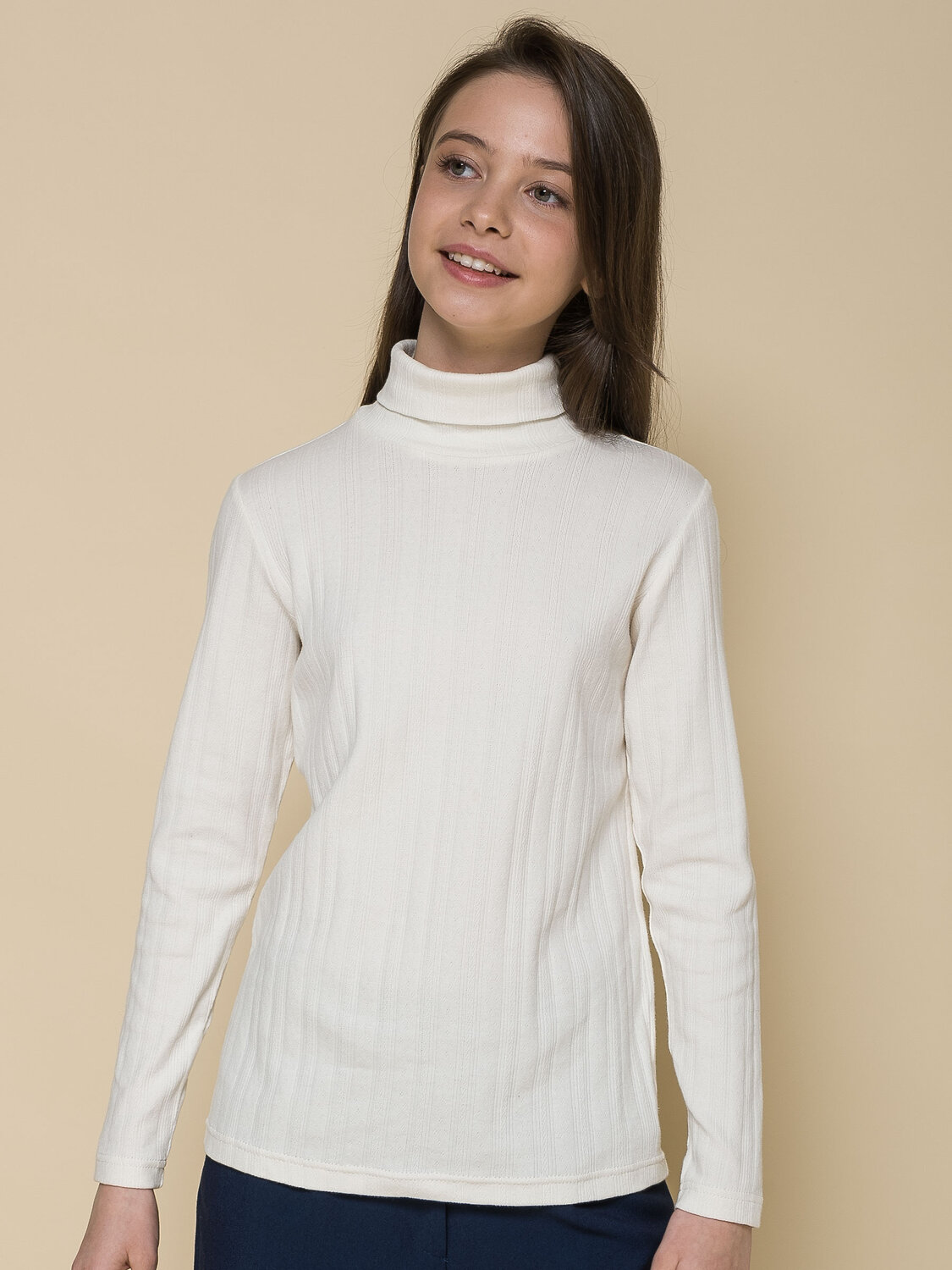 Водолазка из ажурного трикотажа для девочки. В составе ткани преобладает хлопок — изделие мягкое, воздухопроницаемое и комфортное для ребёнка. Благодаря эластану водолазка тянется и при этом сохраняет форму даже после многочисленных стирок. В джемпере комфортно в течение всего дня, ничего не давит, не колет, не сковывает движения. Ажурная фактура деликатно украшает эту модель лаконичного дизайна, делает её нежной и женственной. Воротник-гольф: высокий, мягкий, плотно прилегает к шее. Красивый и практичный вариант для школьной формы. Отлично сочетается как юбками, сарафанами, так и с брюками.