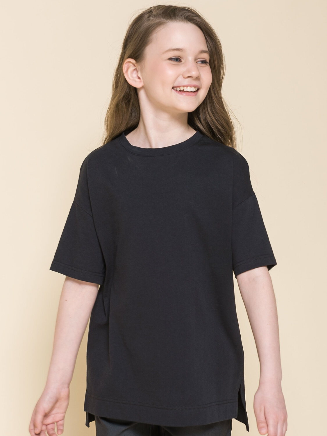 Футболка свободного силуэта со спущенным плечом для девочки. Изделие выполнено из 100% хлопка — ткань мягкая, приятная на ощупь и отлично пропускает воздух. Перепад длин переда и спинки — один из актуальных модных трендов. По бокам разрезы — футболка не будет сковывать движений ребёнка. Благодаря свободному силуэту эта модель прослужит долго, её можно брать на вырост. Ребёнок растёт — футболка не становится малой. Лаконичный дизайн позволяет сочетать футболку с любыми брюками и юбками. Отличный вариант одежды для школы и не только.